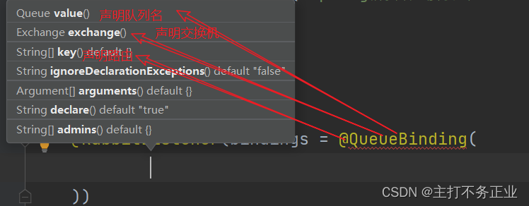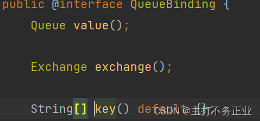 这里简单的说明一下bindings,value,exchange后边为什么使用注解,我们点进去他们的方法可以看到,声明它们的是黄色的注解接口,如图所知