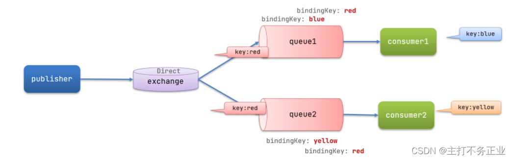- Direct交换机根据RoutingKey判断路由给哪个队列