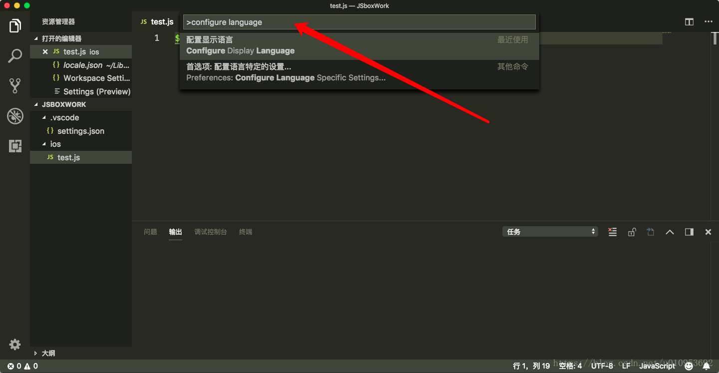 2)使用快捷键组合【Ctrl+Shift+p】,在搜索框中输入“configure display language”,点击确定后;