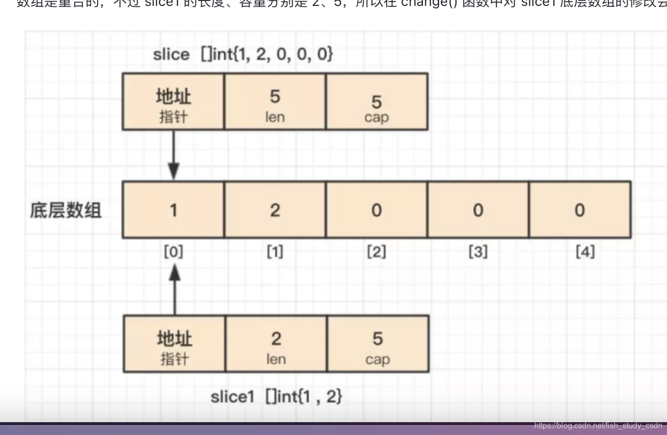 知识点:可变函数、append()操作。Go 提供的语法糖…,可以将 slice 传进可变函数,不会创建新的切片。第一次调用 change() 时,append() 操作使切片底层数组发生了扩容,原 slice 的底层数组不会改变;第二次调用change() 函数时,使用了操作符[i,j]获得一个新的切片,假定为 slice1,它的底层数组和原切片底层数组是重合的,不过 slice1 的长度、容量分别是 2、5,所以在 change() 函数中对 slice1 底层数组的修改会影响到原切片。