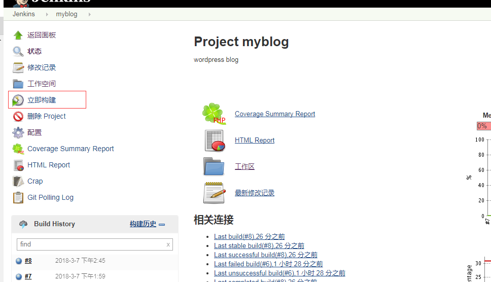 第一次配置好jenkins project之后,会自动触发一次构建。此后,每当有commit 提交到master分支(前面设置的是master分支,也可以设置为其他分支),就会触发一次构建。当然也可以在project页面手动触发构建。点击左边的"立即构建" 手动触发构建。