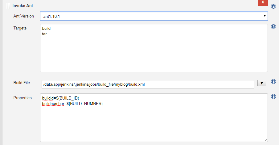 最后这个target "tar" 就是打包文件。因为上面的build 并没有包含这个target,所以默认情况下,执行build是不会打包文件的,所以在jenkins project配置界面,Ant构建那一步的targets,我们才会有"build" 和 "tar" 这两个targets。如果build.xml 中 "build"这个target depends中已经包含"tar" , 就不需要在jenkins中增加"tar"了。