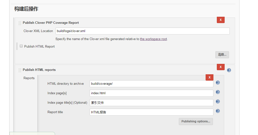 Publish Clover PHP Coverage Report:发布代码覆盖率xml格式的文件报告。路径会在"build.xml"文件中定义