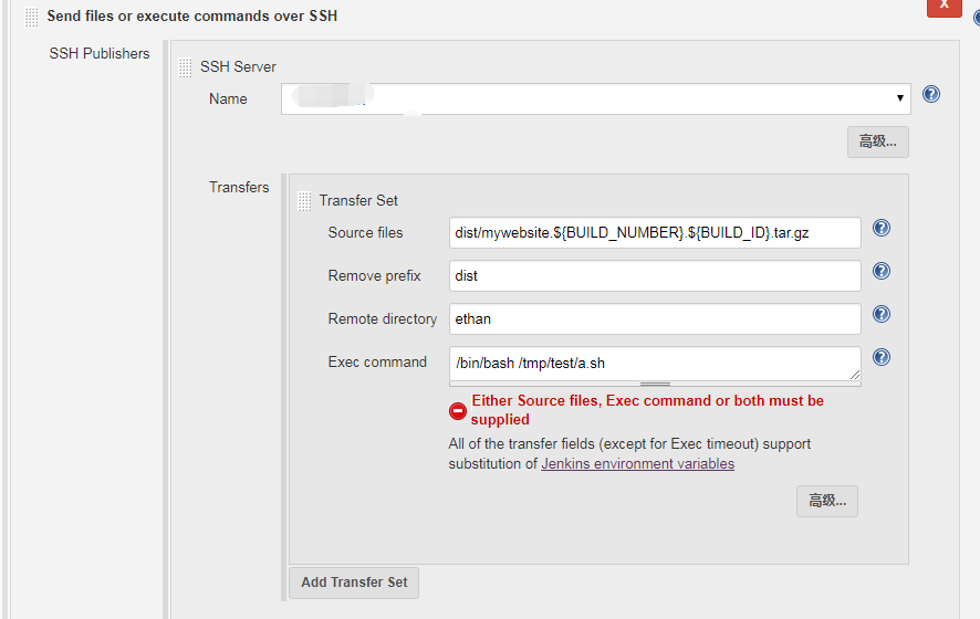 Name: SSH Server的名称。SSH Server可以在jenkins-系统设置中配置。