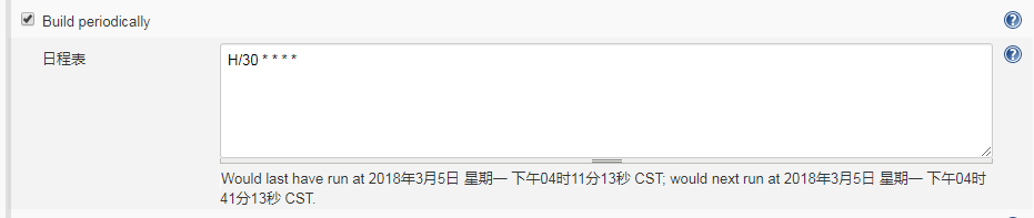 Build periodically: 周期性的构建。很好理解,就是每隔一段时间进行构建。日程表类似 linux crontab书写格式。如下图的设置,表示每隔30分钟进行一次构建。