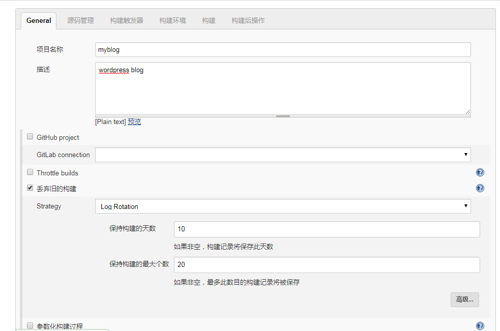 丢弃旧的构建: 服务器资源是有限的,有时候保存了太多的历史构建,会导致Jenkins速度变慢,并且服务器硬盘资源也会被占满。当然下方的"保持构建天数" 和 保持构建的最大个数是可以自定义的,需要根据实际情况确定一个合理的值。
