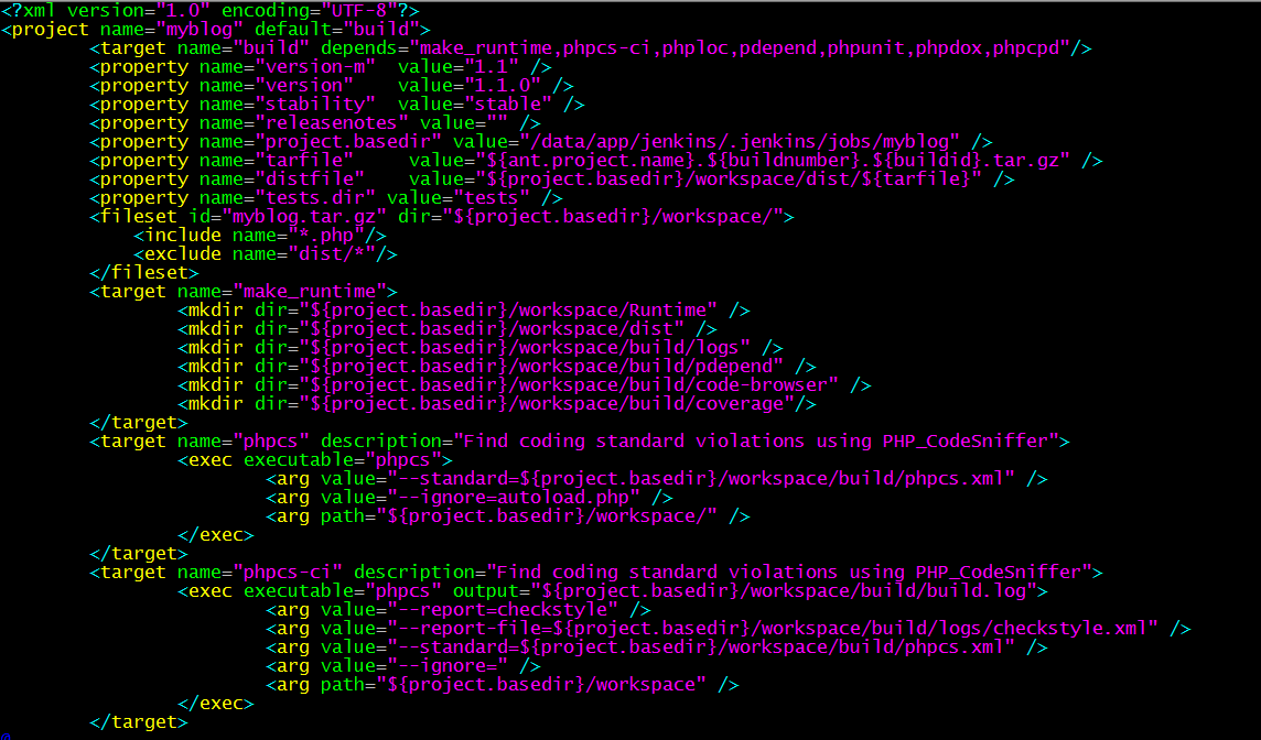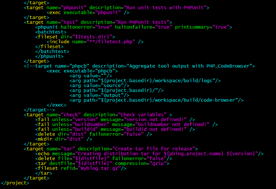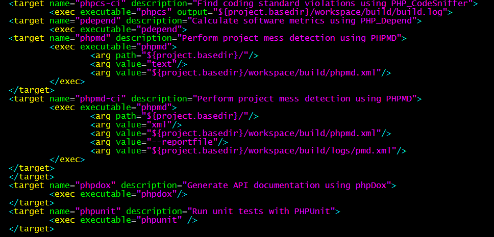 其他一些target 都是利用一些工具对php代码的操作,比如phpunit是进行php单元测试。这一些方面我没有深入的研究,只是进行了一些简单的配置,毕竟不是这方面的专业人士。