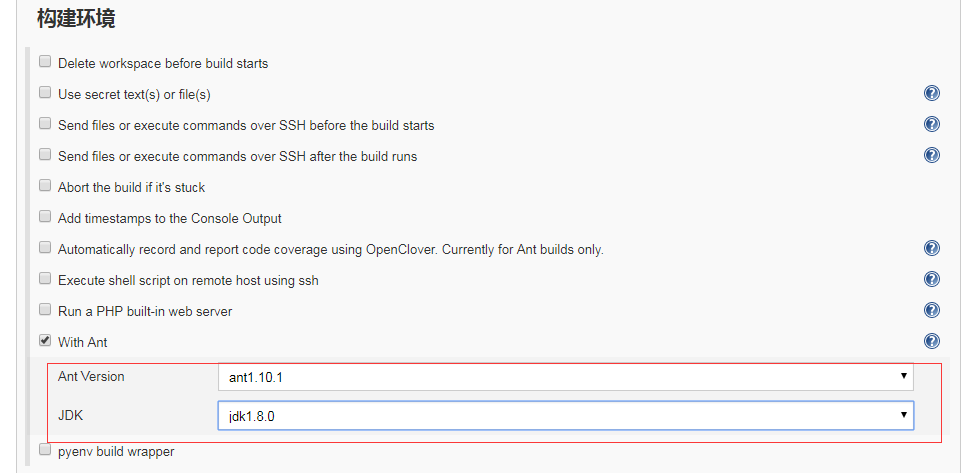 构建环境就是构建之前的一些准备工作,如指定构建工具(在这里我使用ant)。