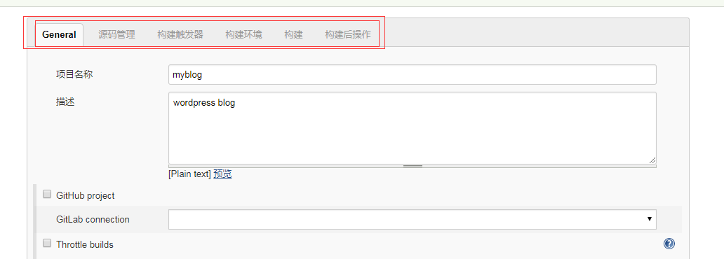 图是构建任务设置界面,可以看到上方的几个选项"General", "源码管理", "构建触发器","构建环境", "构建", "构建后操作"。下面逐一介绍。
