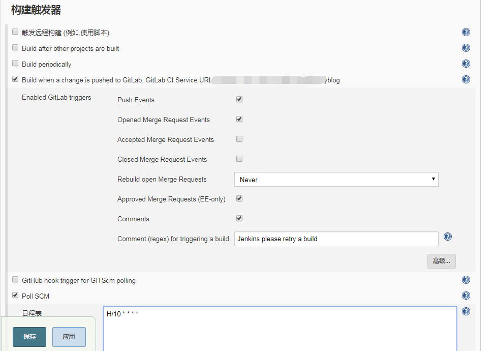 Build when a change is pushed to GitLab:当有更改push到gitlab代码仓库,即触发构建。后面会有一个触发构建的地址,一般被称为webhooks。需要将这个地址配置到gitlab中,webhooks如何配置后面介绍。这个是常用的构建触发器。