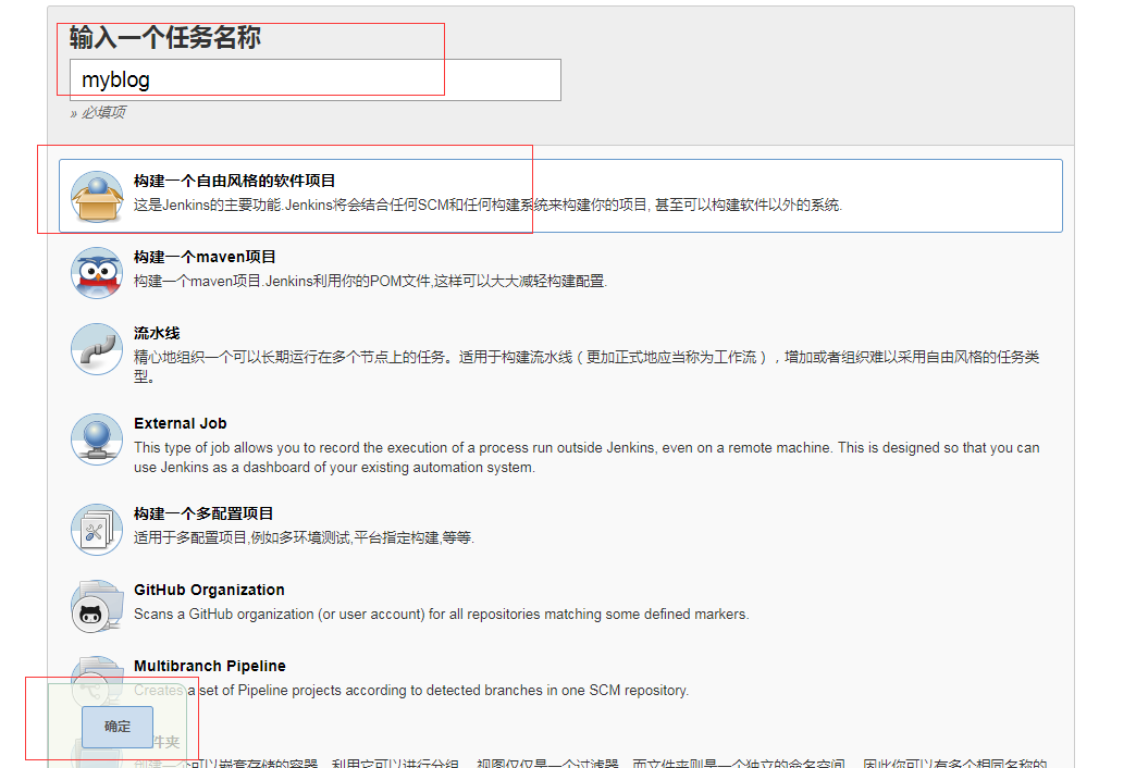 跳转到如下界面。任务名称可以自行设定,但需要全局唯一。输入名称后选择构建一个自由风格的软件项目(其他选项不作介绍)。并点击下方的确定按钮即创建了一个构建任务。之后会自动跳转到该job的配置页面。