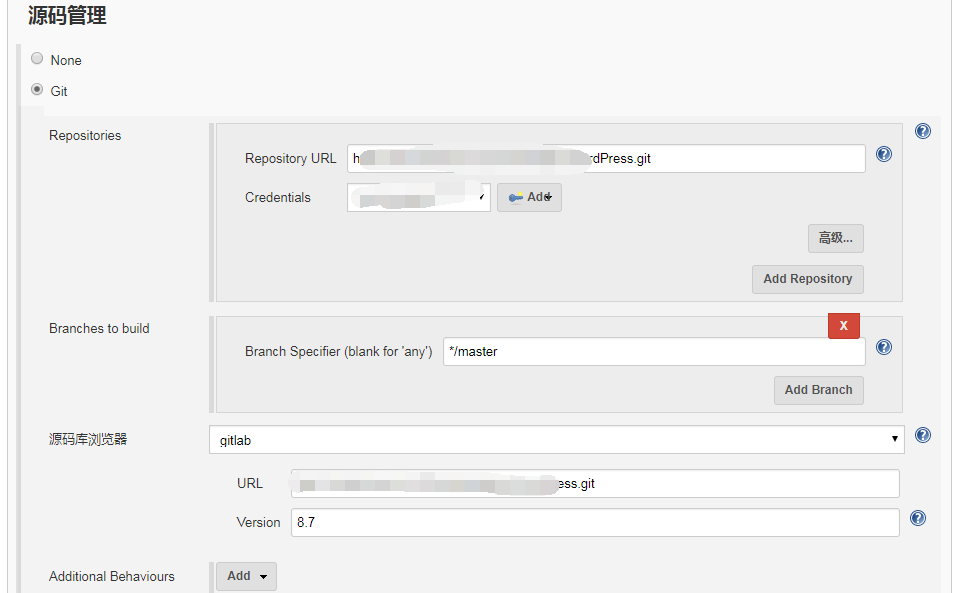 Branches to build:构建的分支。*/master表示master分支,也可以设置为其他分支。