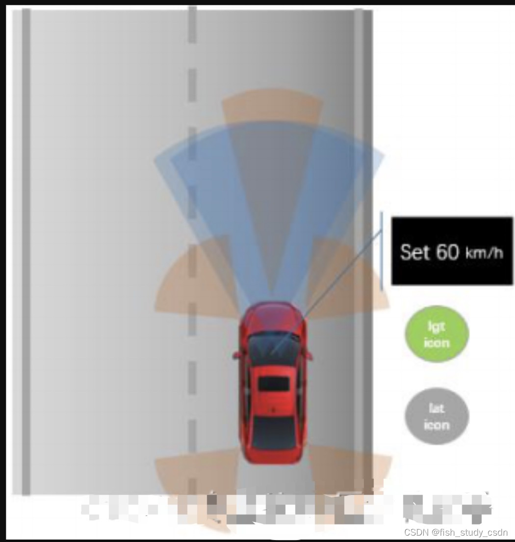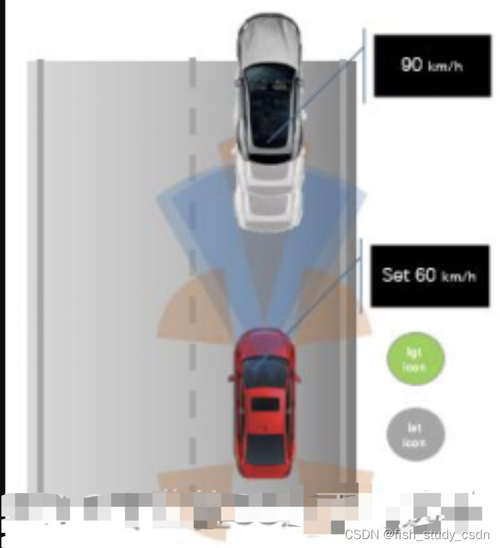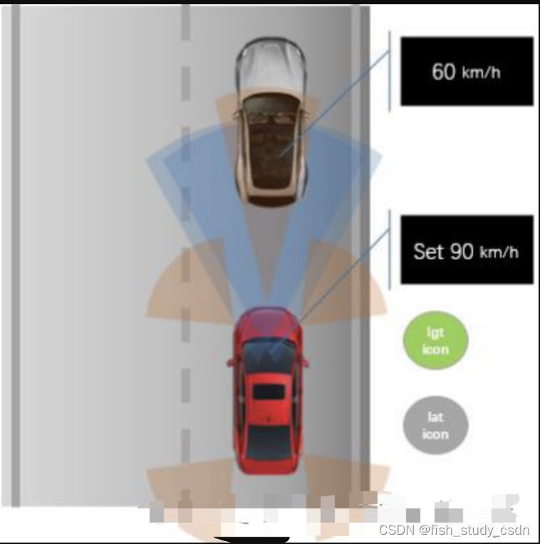 自适应巡航控制(Adaptive Cruise Control),它通过单目摄像头与雷达数据融合来检测前方车辆距离及相对速度,控制油门和刹车系统以实现稳定跟随前方车辆,且达到驾驶员设定的目标时距。在没有前方车辆时,ACC实现传统定速巡航的功能,使自车稳定至驾驶员设定的车速。ACC自适应巡航在高速公路下,能够辅助驾驶员以更轻松舒适的状态控制车辆。