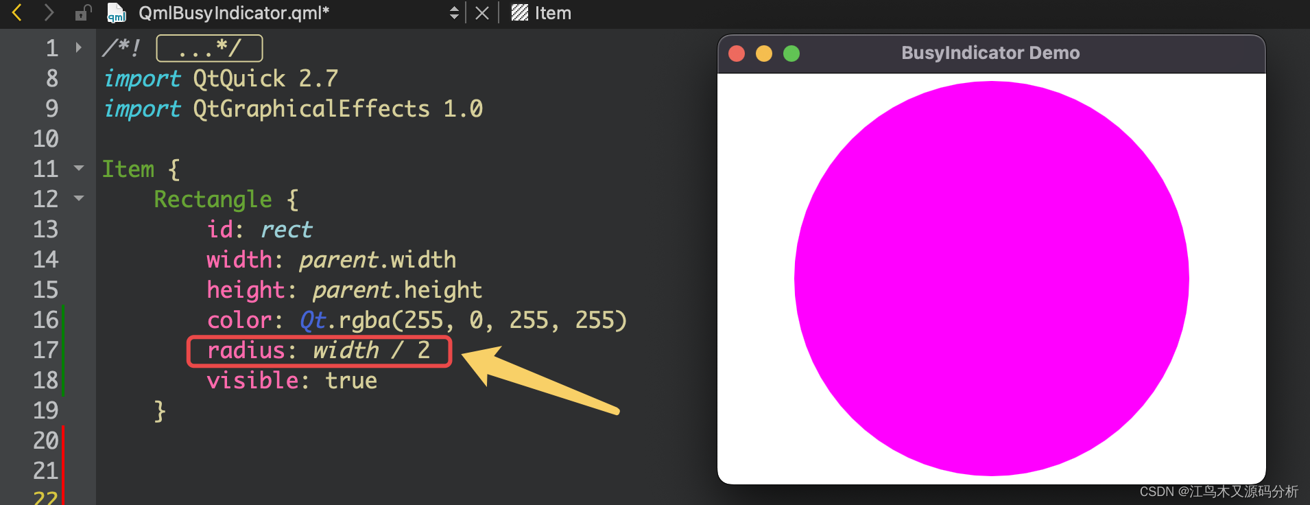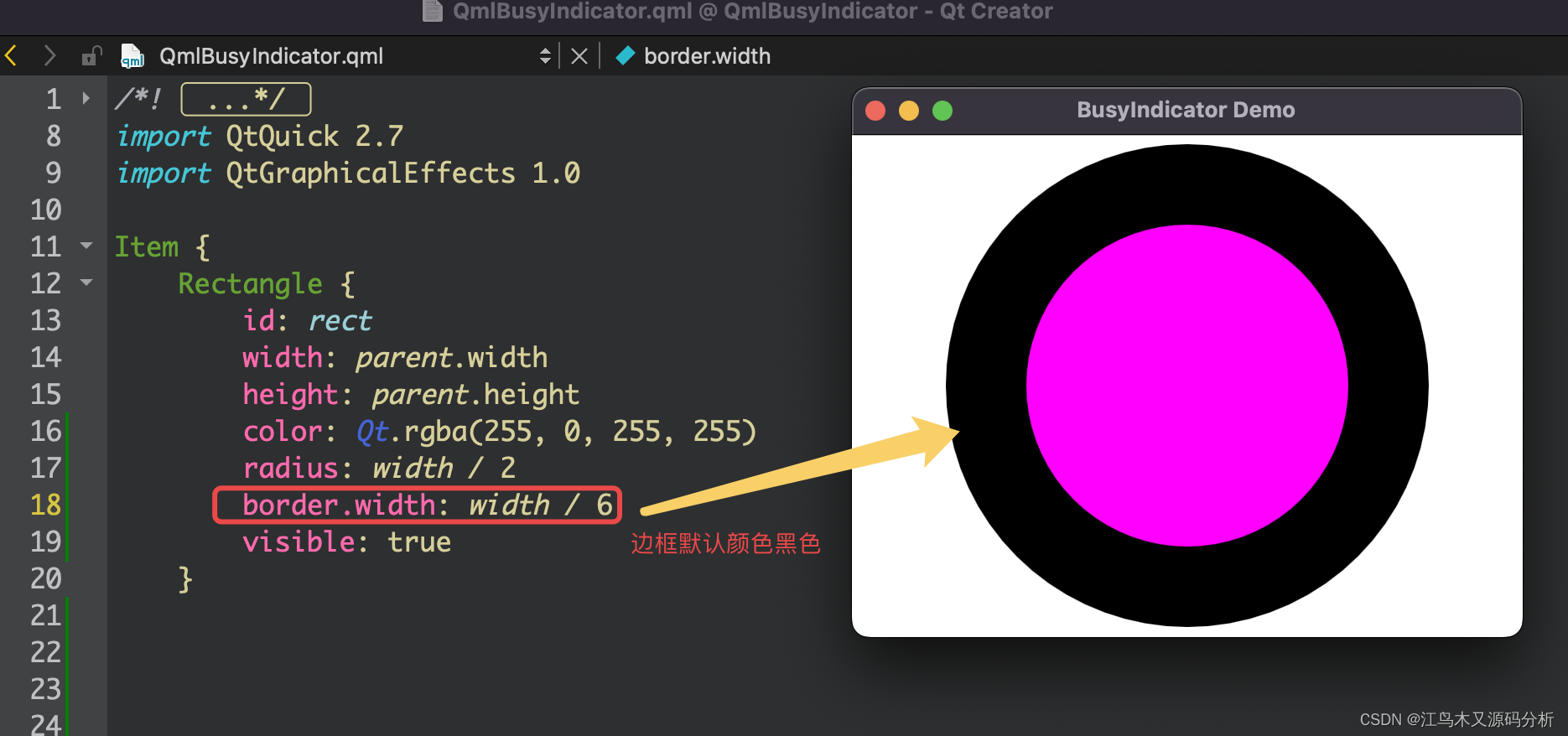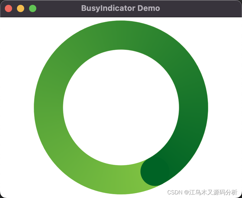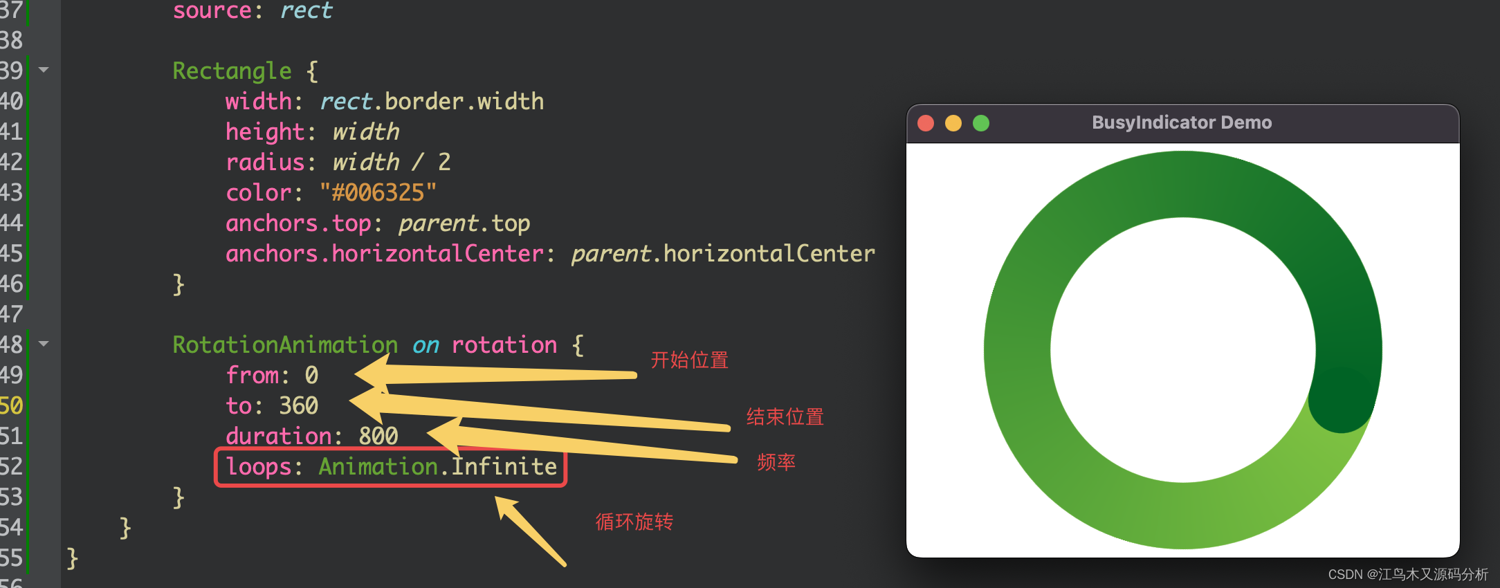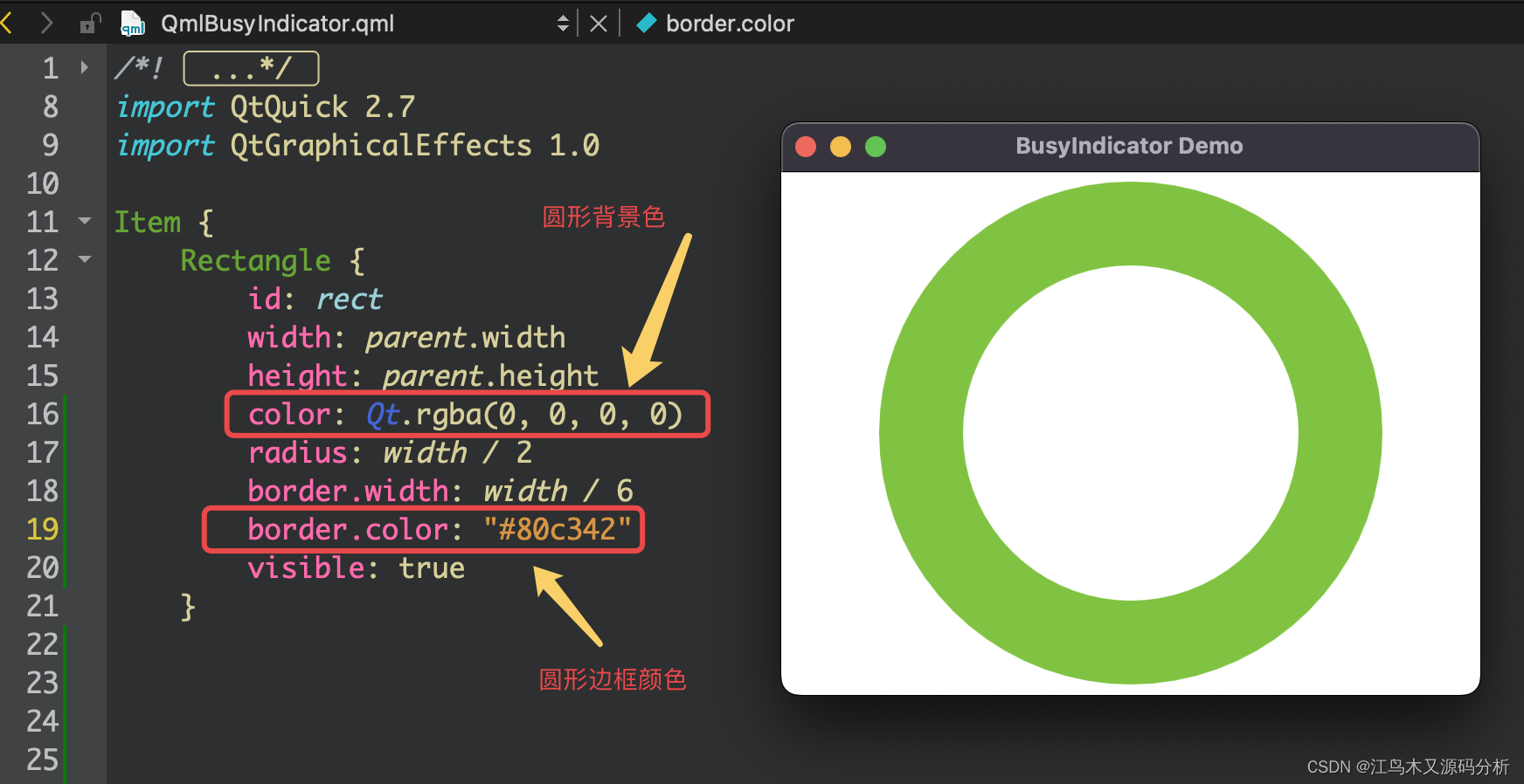 本文介绍如何使用QML实现自定义加载动画,包括创建不同颜色的圆形、设置边框及渐变效果,并通过动画实现圆点旋转,最终形成一个美观且可自定义颜色的加载指示器。