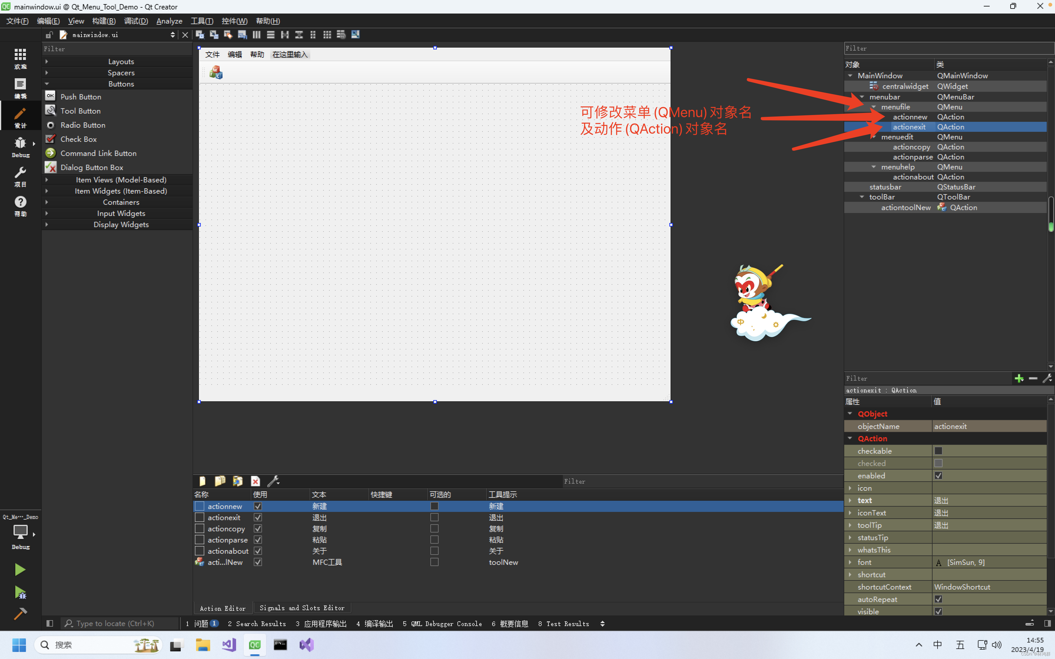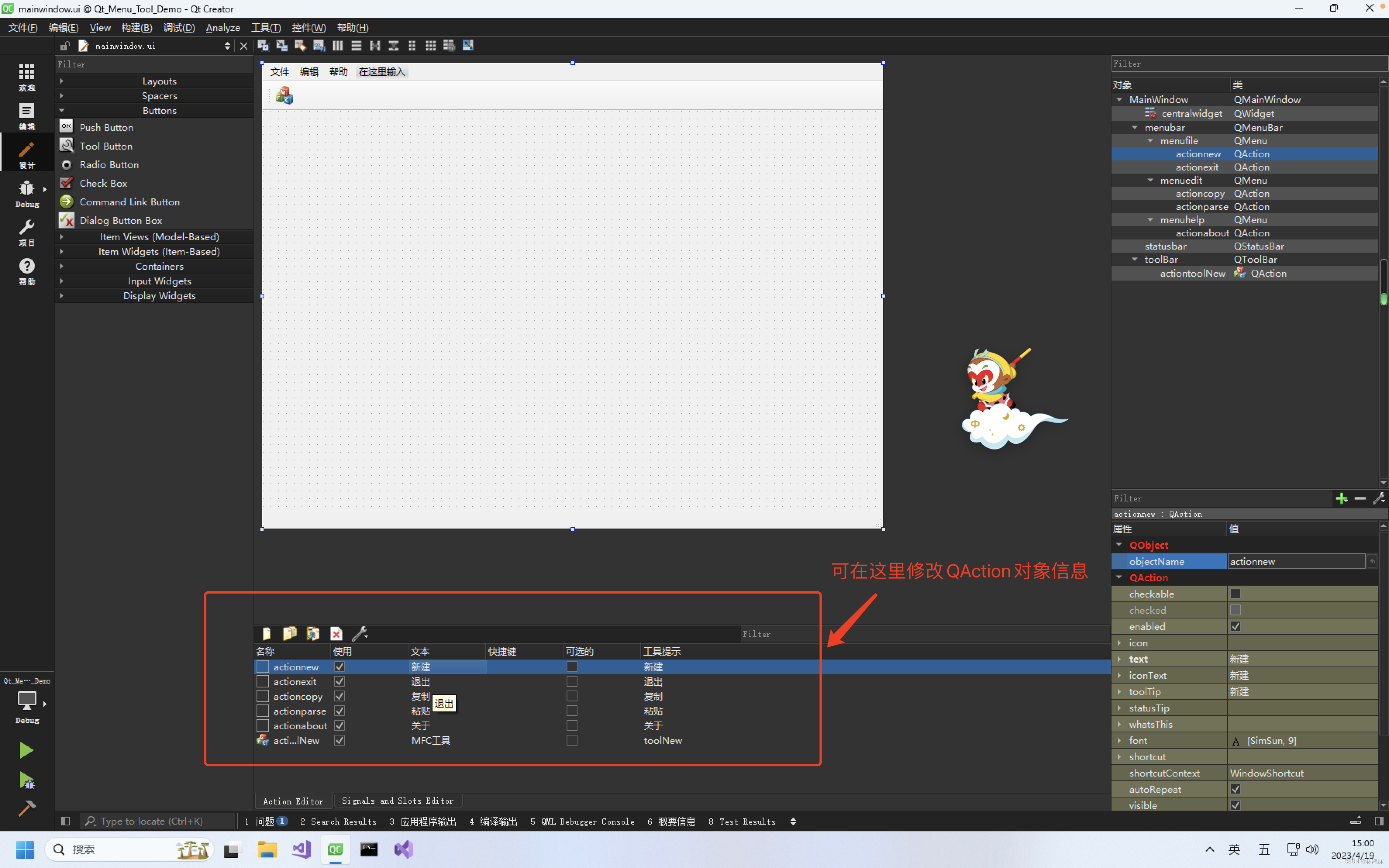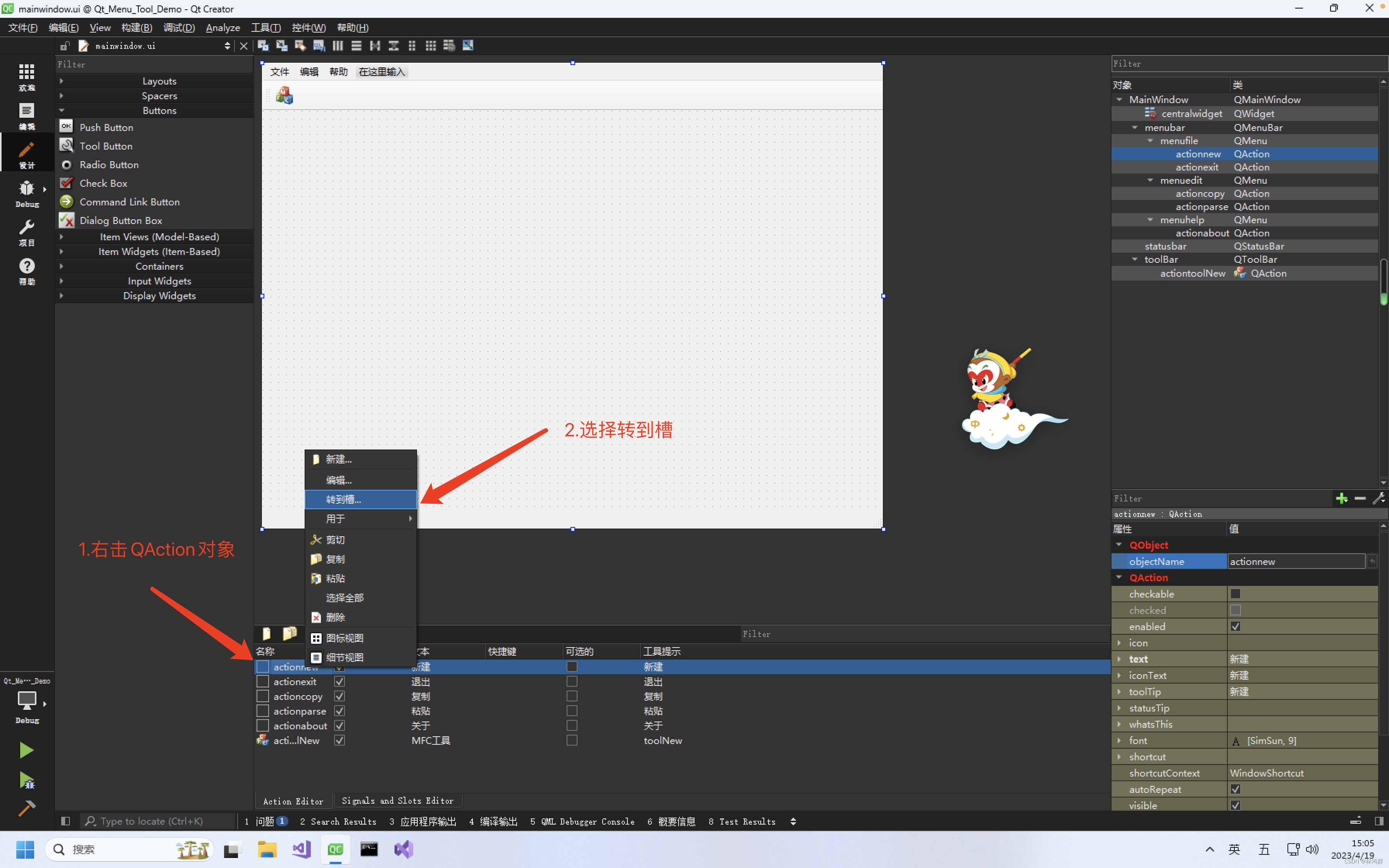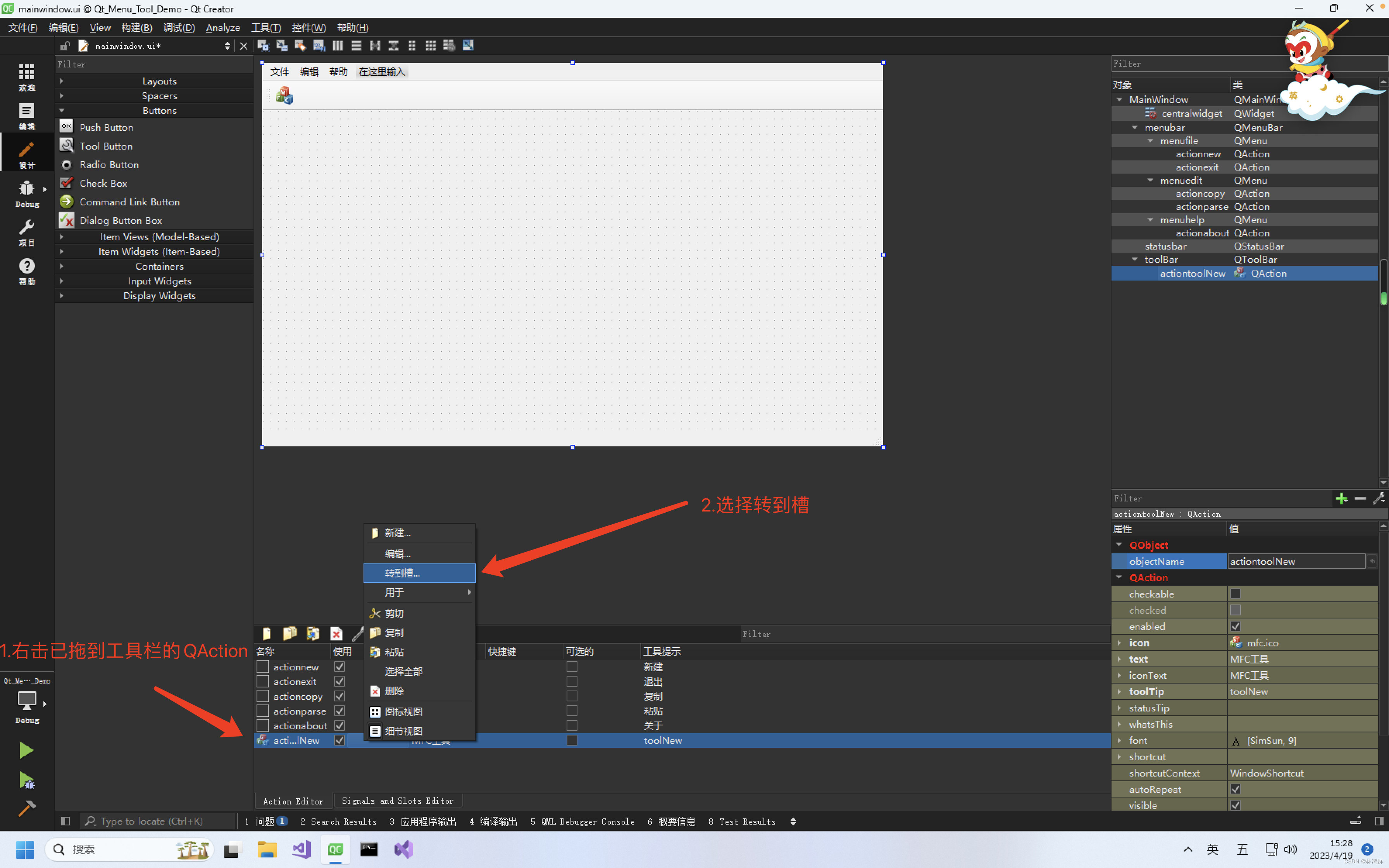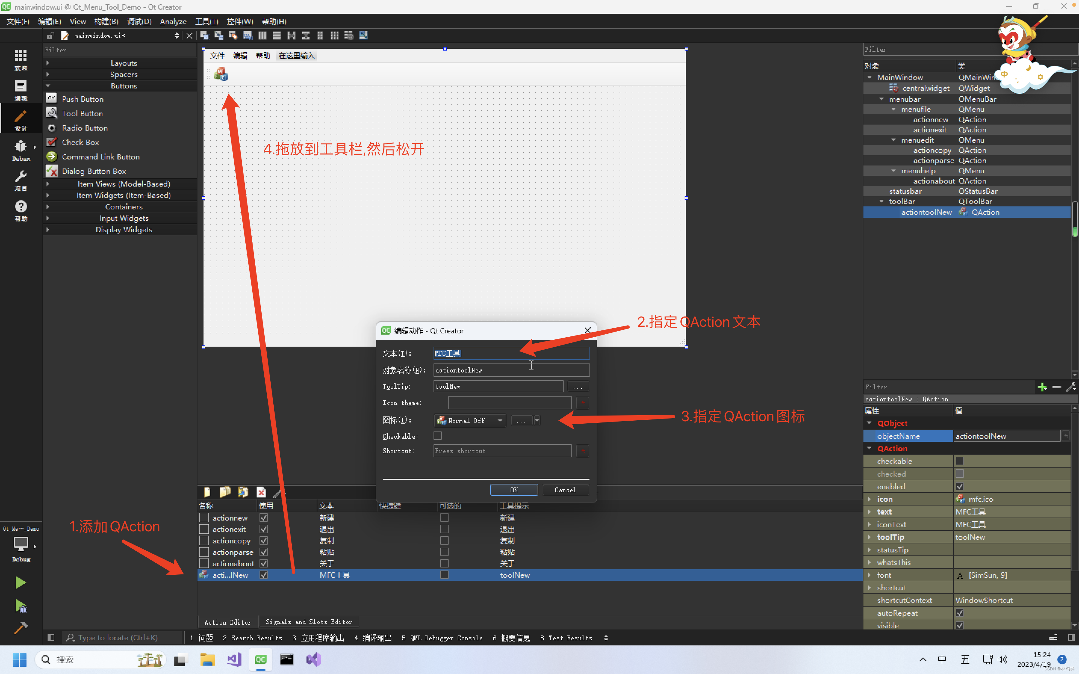 3.取得UI设计器生成的工具栏对象,并向工具栏添加QAction
