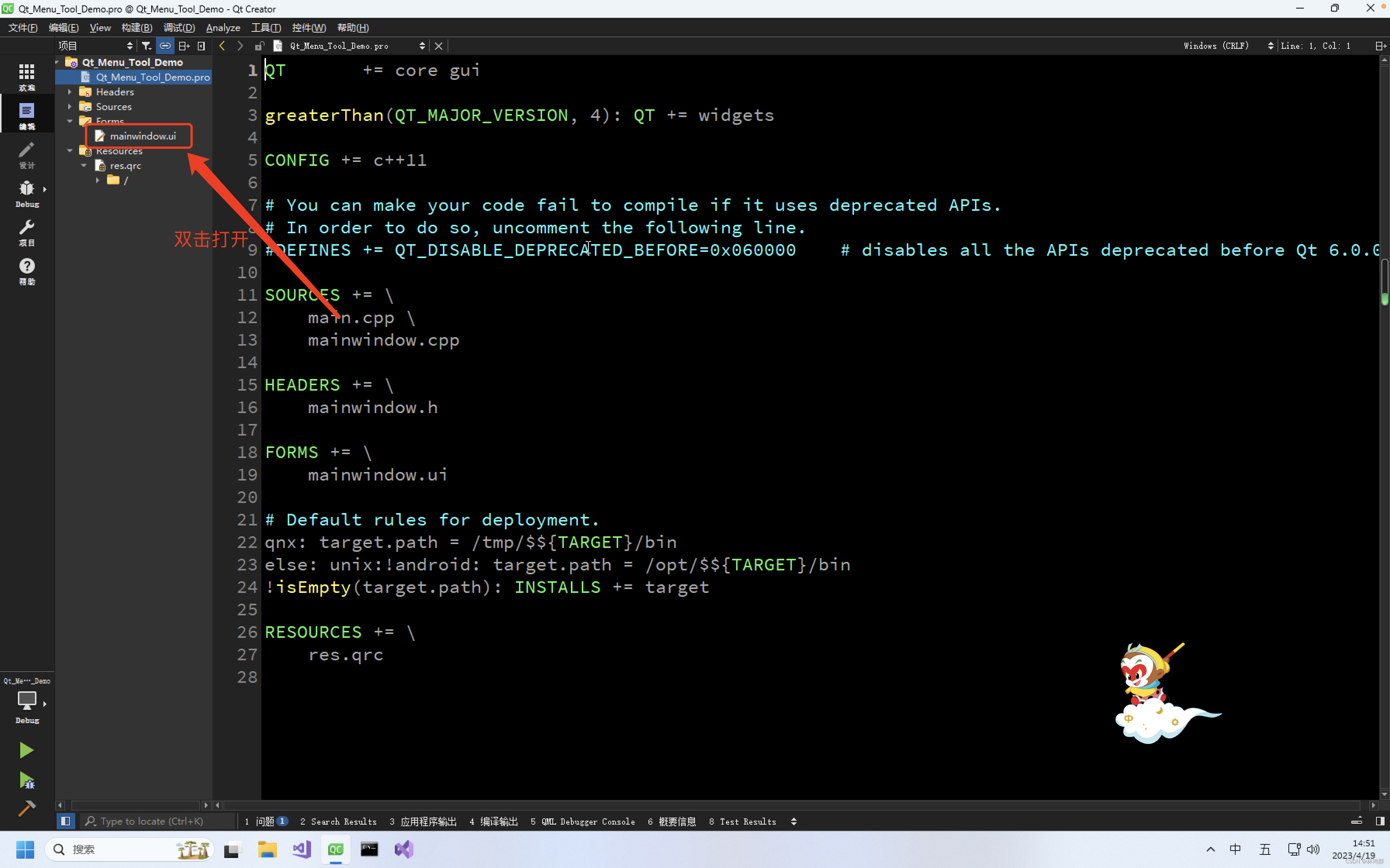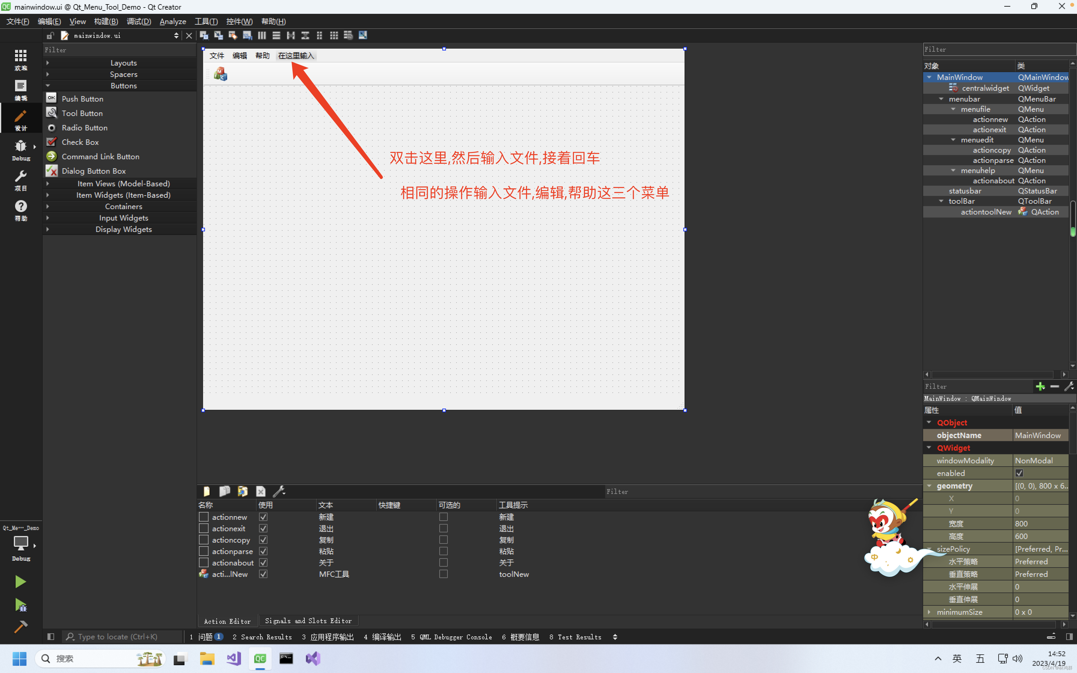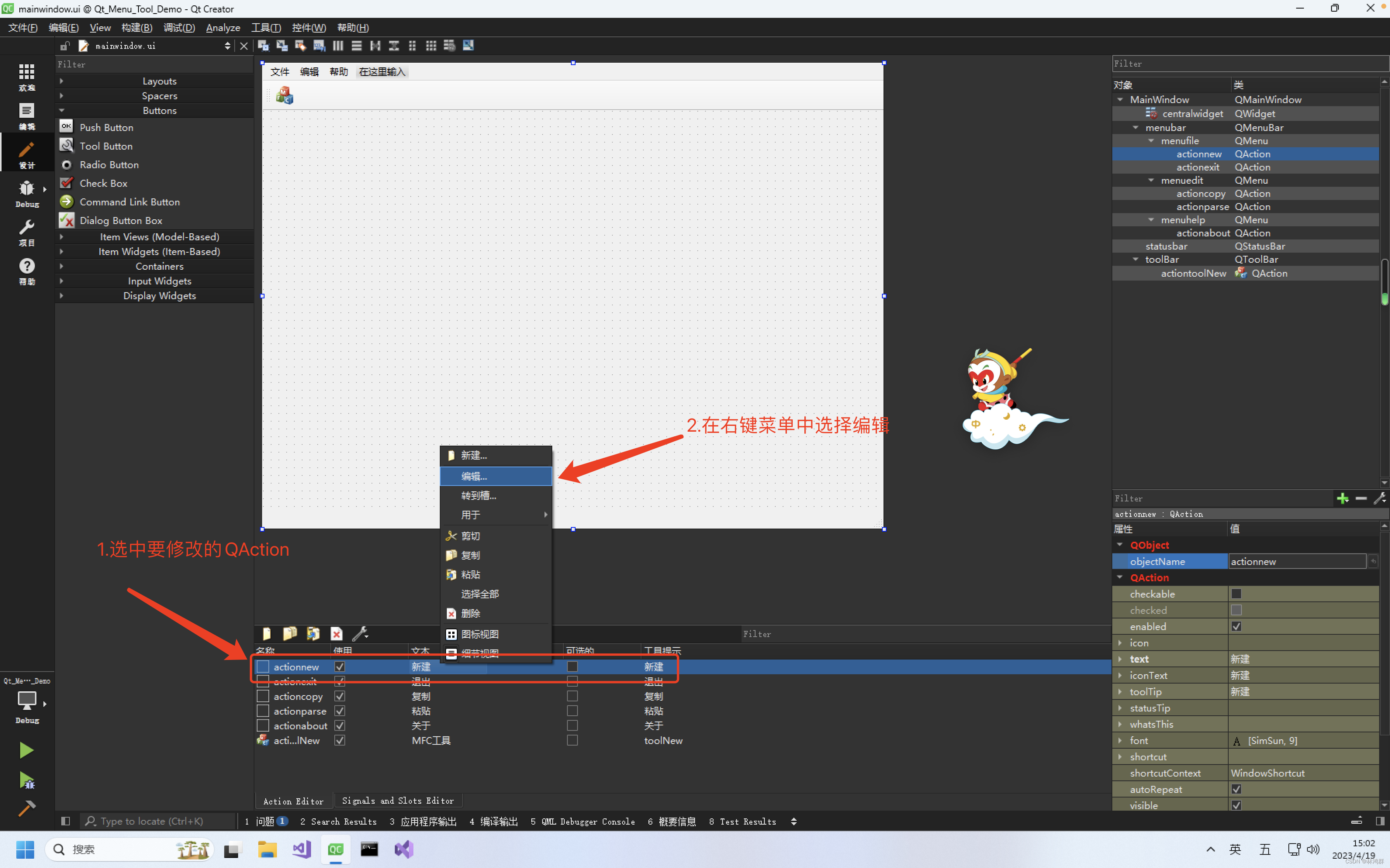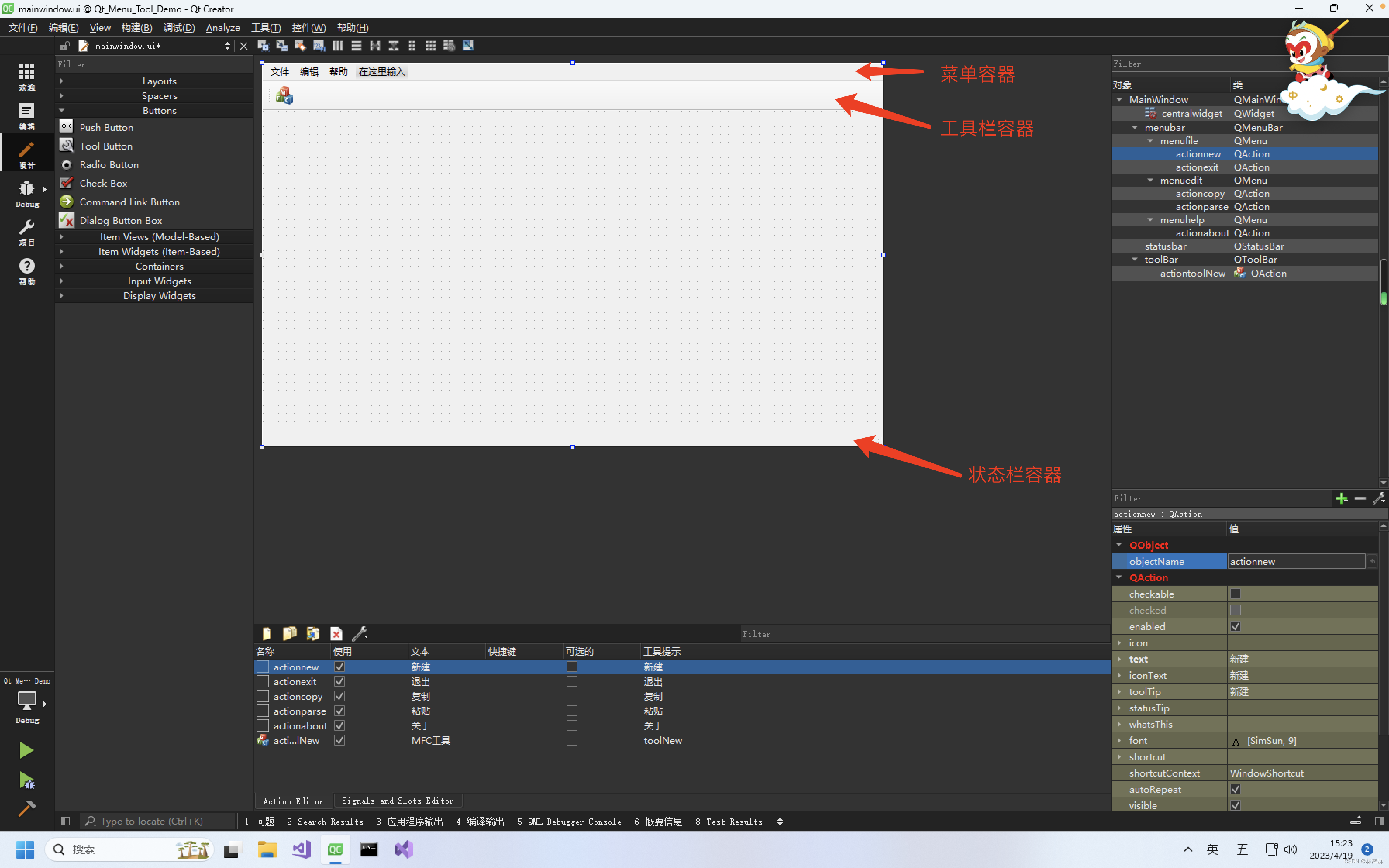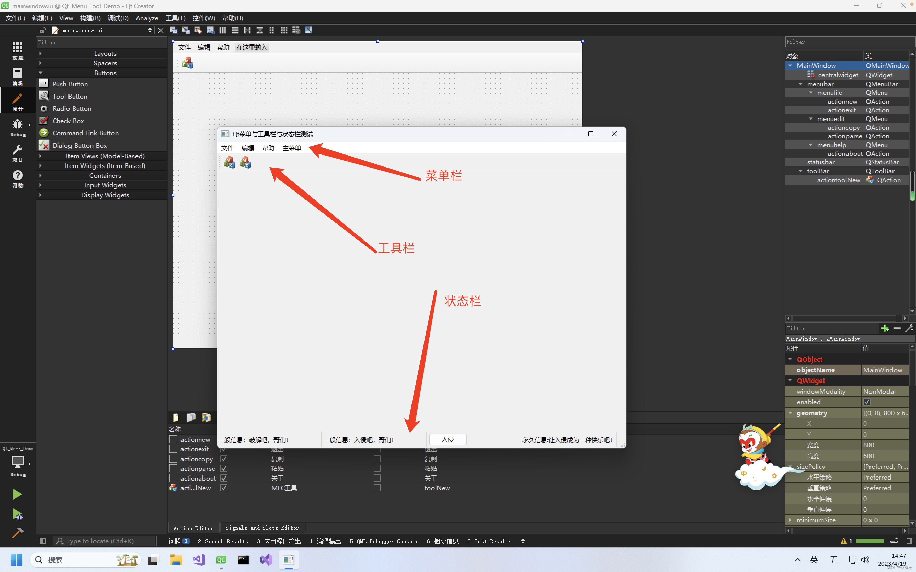 3.取得UI设计器生成的工具栏对象,并向工具栏添加QAction