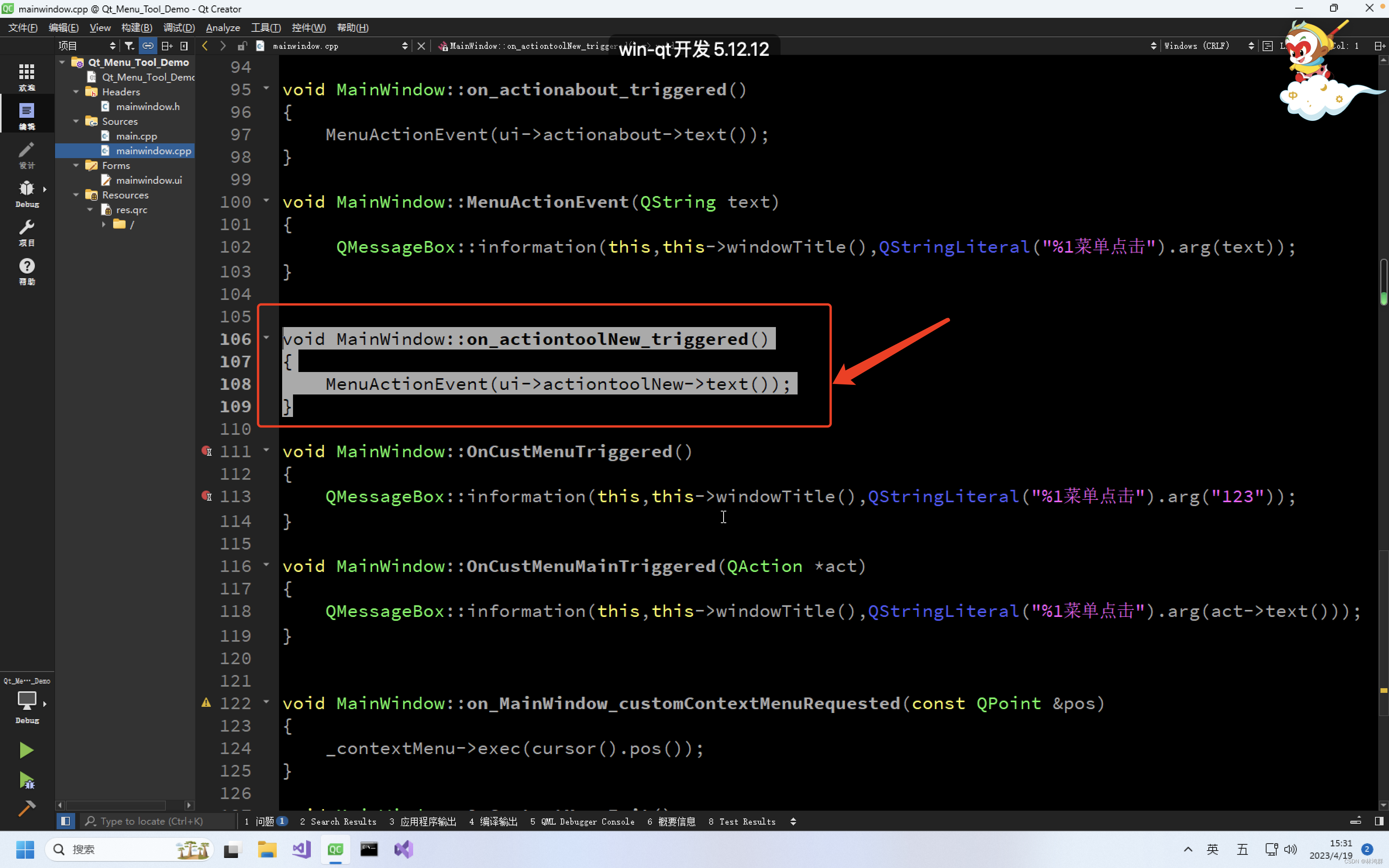 在槽函数中实现相关的功能,点击该工具按钮时会执行到该槽函数中,执行实现的功能