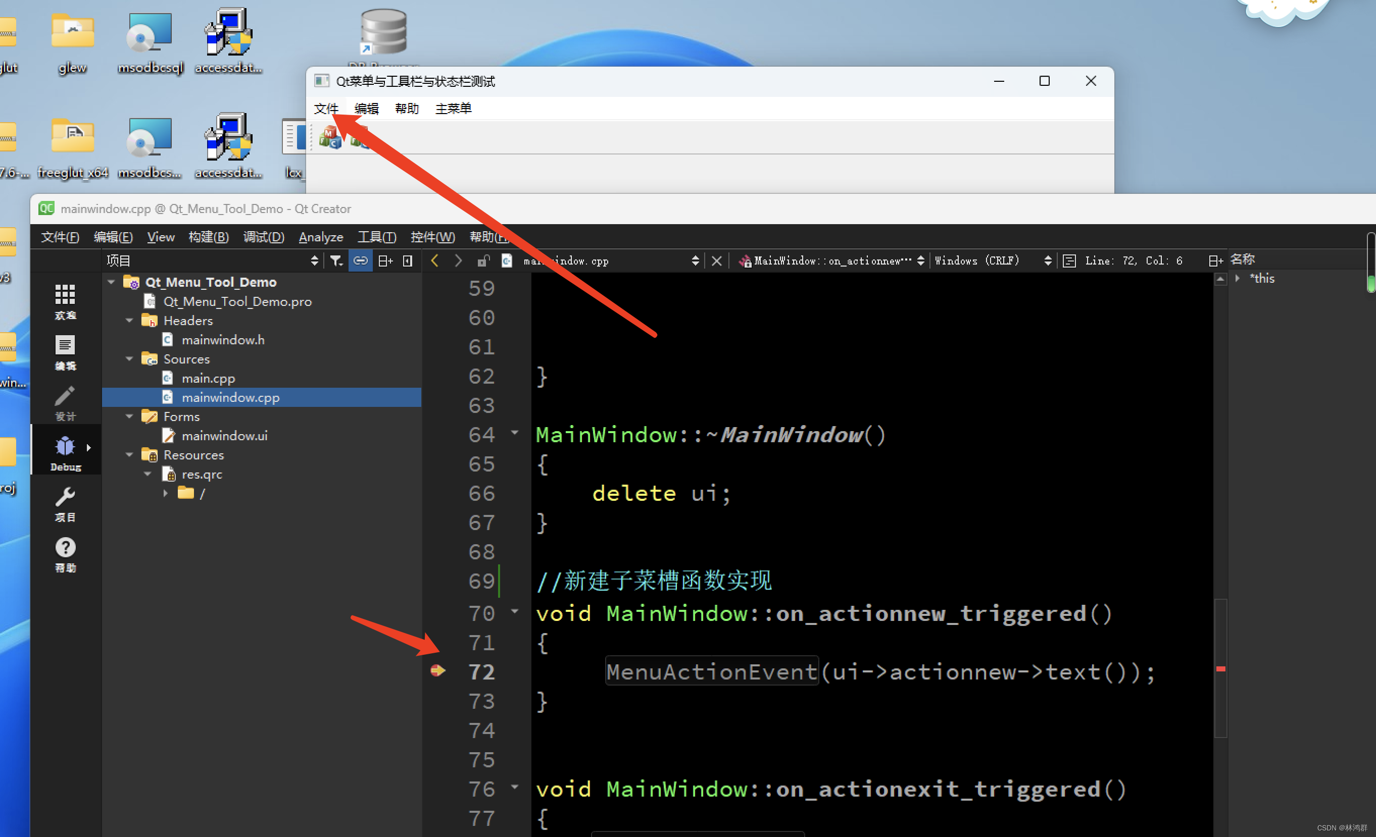 断点验证,点击新建菜单,成功进入对就的槽函数体中:
