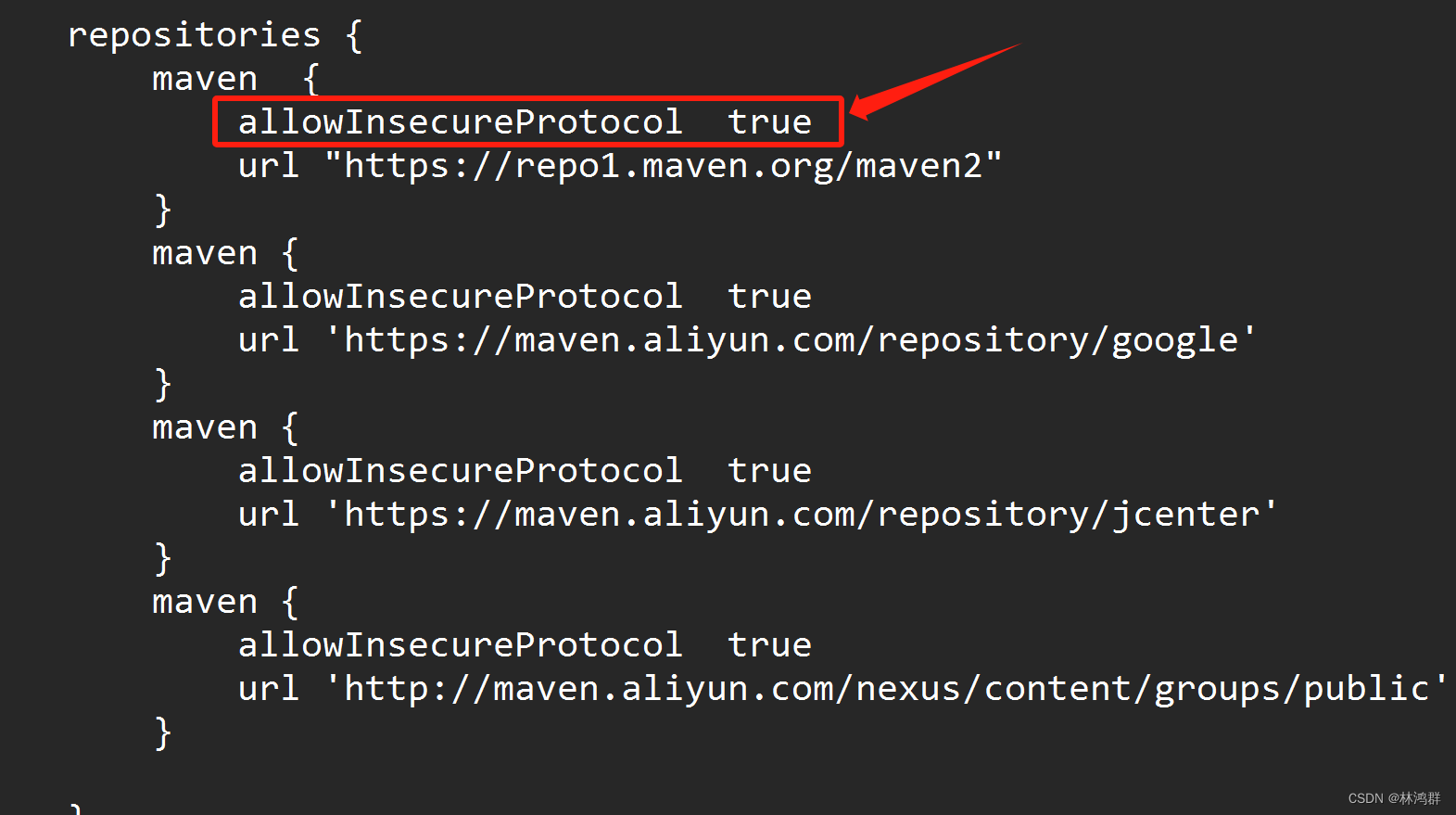 3.修改build.gradle 所有仓库地址加上HTTPS验证:allowInsecureProtocol true