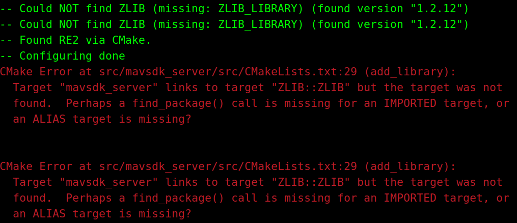 Target "mavsdk_server" links to target "ZLIB::ZLIB" but the target was not