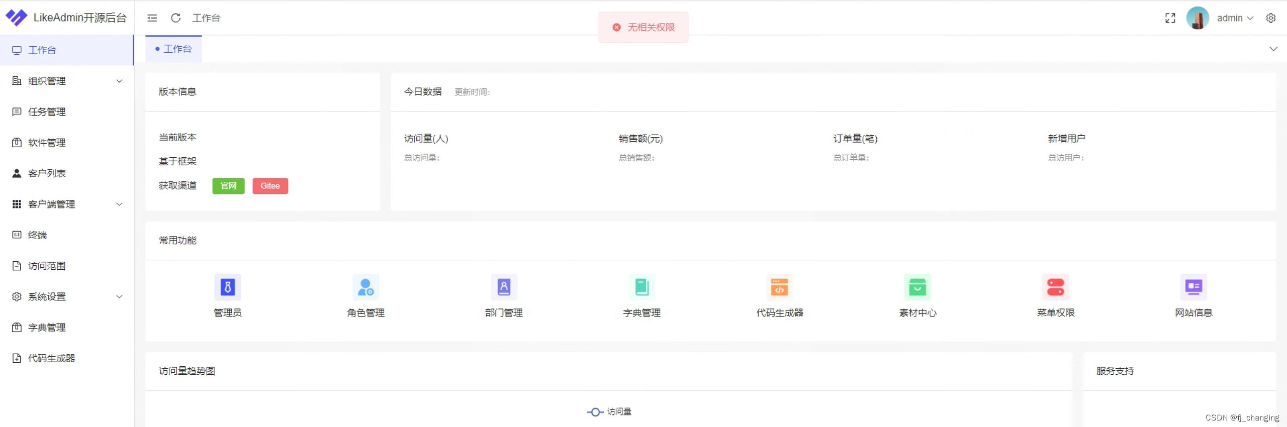 新建非超级管理员账号,设置角色,并且角色对应的权限全部勾选,然后登录这个账号,登录成功自动跳转到工作台,页面提示无相关权限。