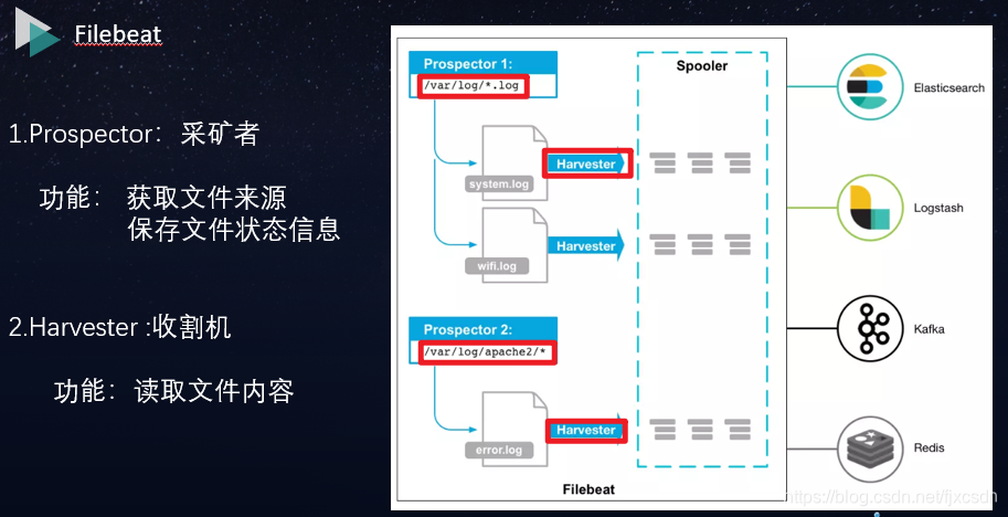 ① 一个收割机负责一个日志文件,收割过程如下,打开文件,负责读取文件内容,它将逐行读取每个文件,并将读取的内容搬运到es或者kafka等。