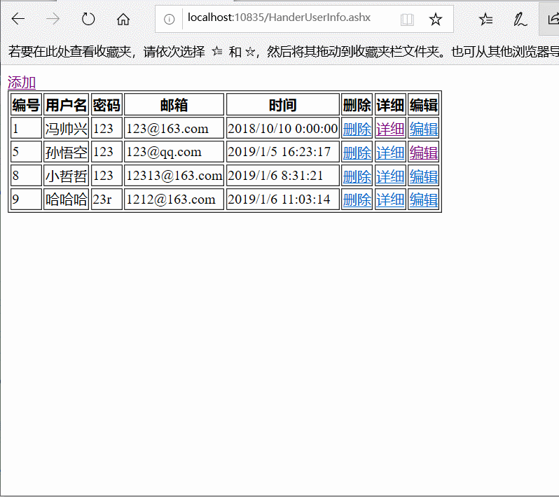 { //添加成功后返回到handerUserinfo.ashx界面,重新加载数据库数据