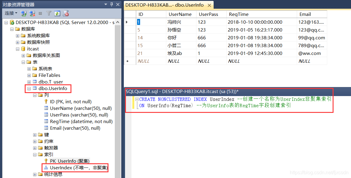 ON UserInfo(RegTime) --为UserInfo表的RegTime字段创建索引