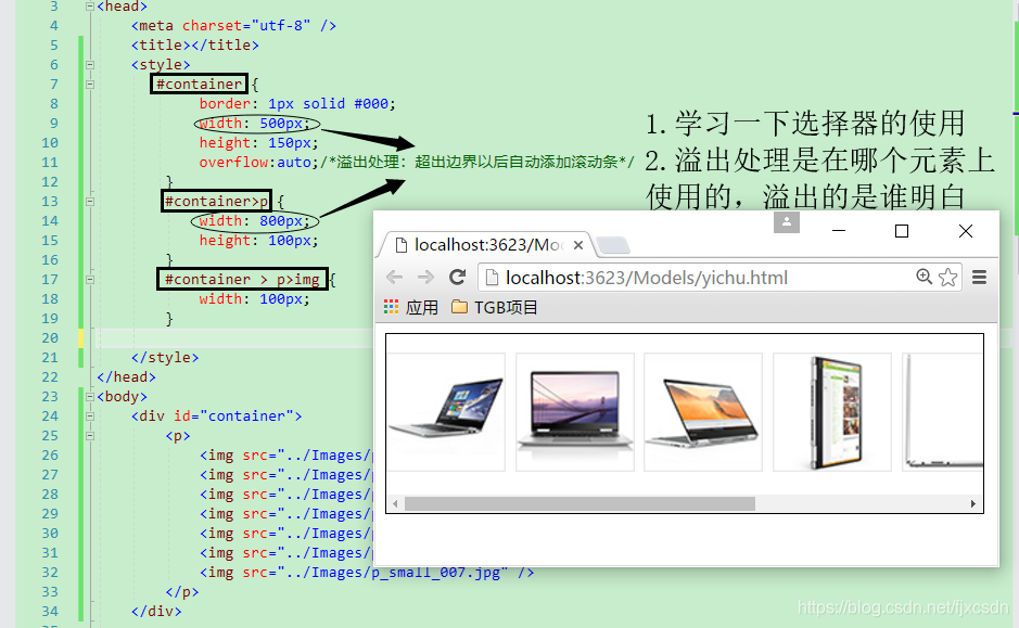 溢出处理:当内容多,元素小的时候,就会产生溢出的效果,默认都是纵向溢出