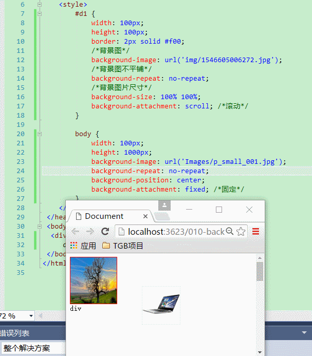 | 作用 | 将背景图固定在网页的某个位置处,一直在可视化区域中,不会随着滚动条而发生位置的变化 |