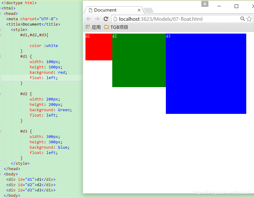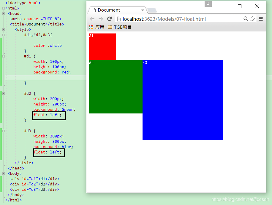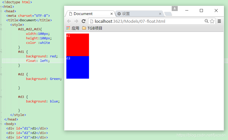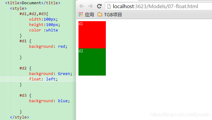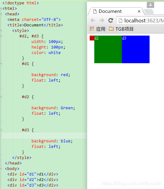 当d2进行左浮动时,他应该浮动到d1的位置,可是d1没有浮动,只能在原来位置浮动,当d3进行左浮动时,发现自己左浮动的位置,d2正在做浮动,所以只能在d2的右边进行浮动。