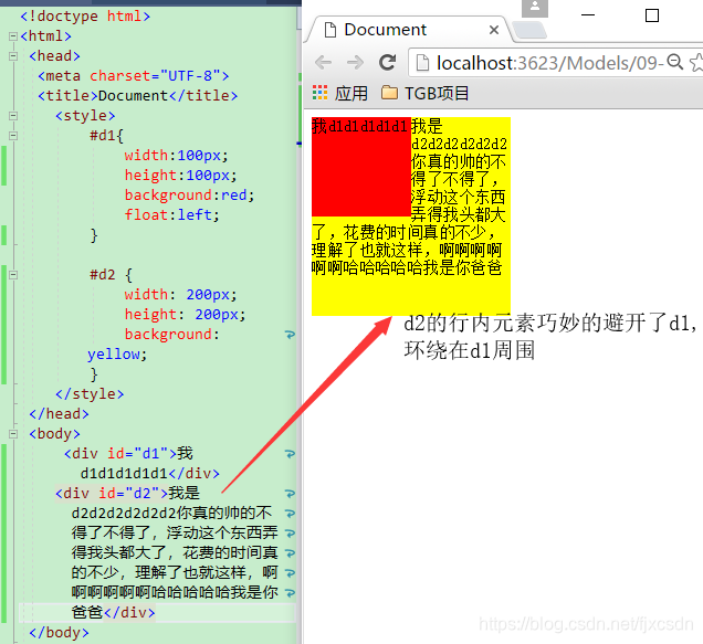 元素一旦浮动起来后,宽度将以内容为主(未指定宽度情况下)如下图:d1没有指定宽度和长度,默认大小为d1的内容大小