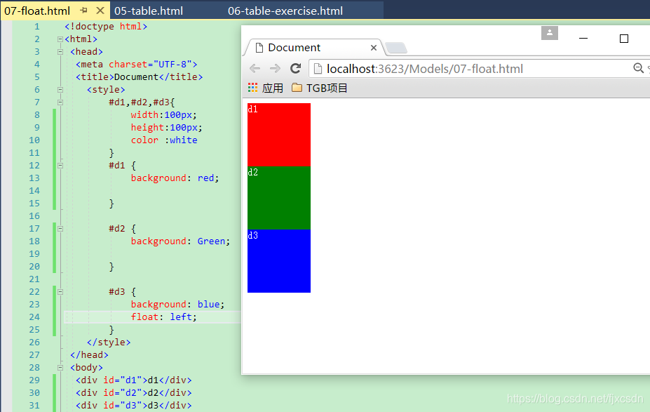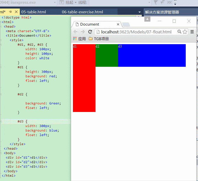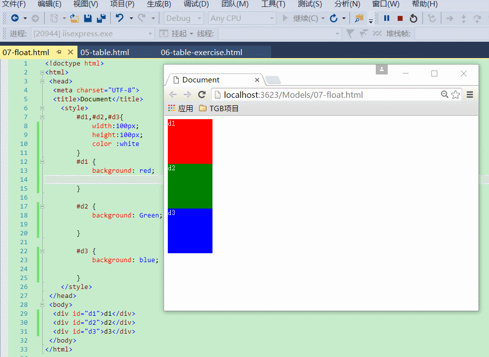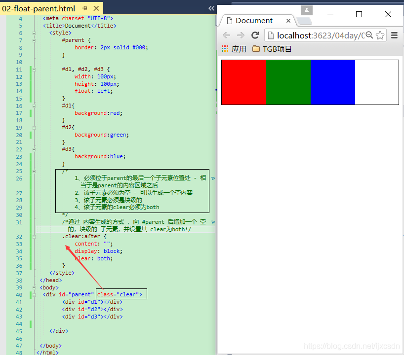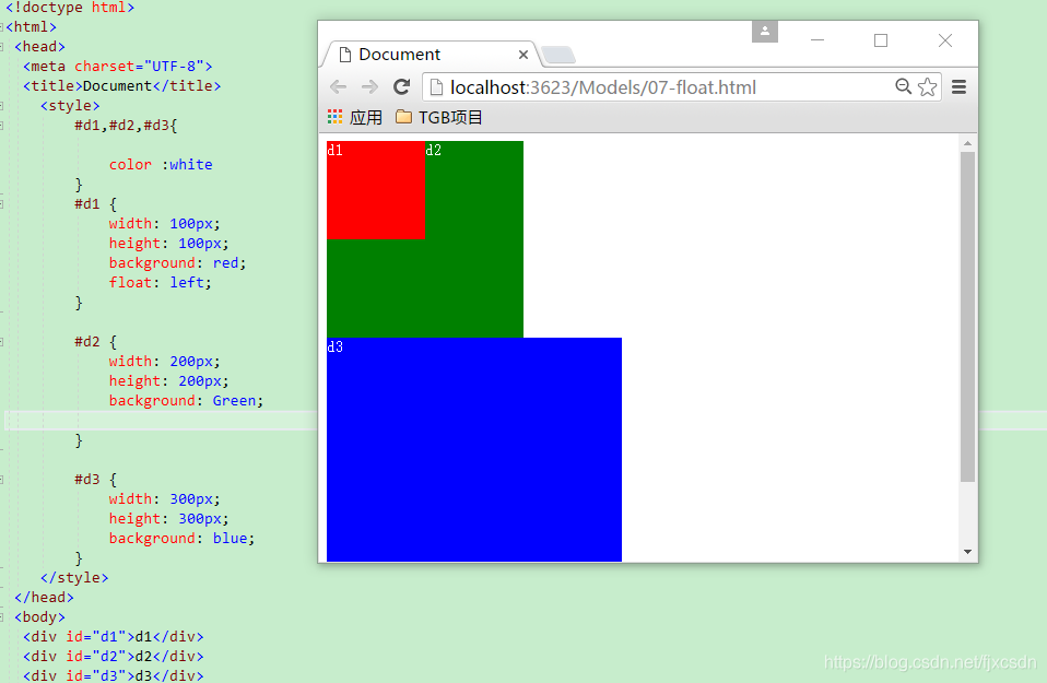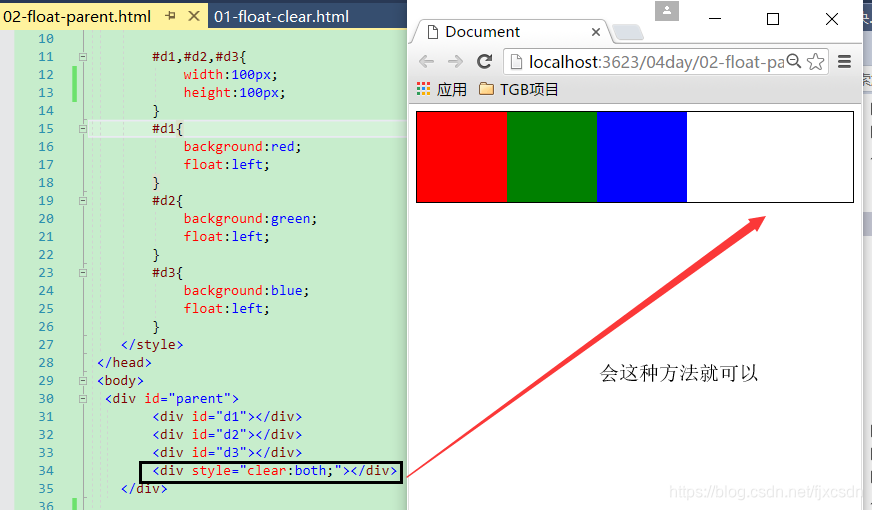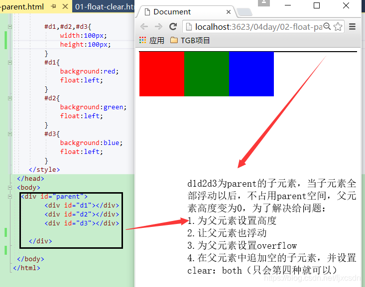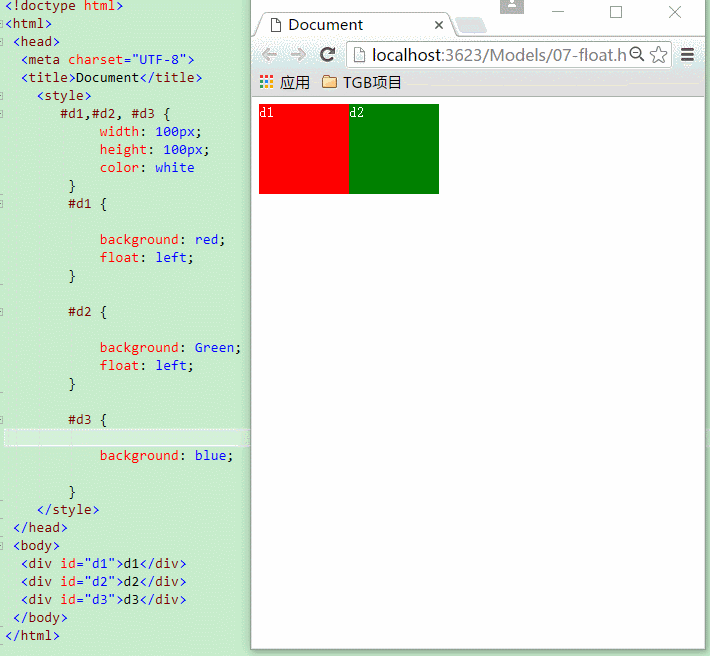 效果展示:如果d3不受d2左浮动的影响,则使用clear属性,清除d2浮动所带来的影响。