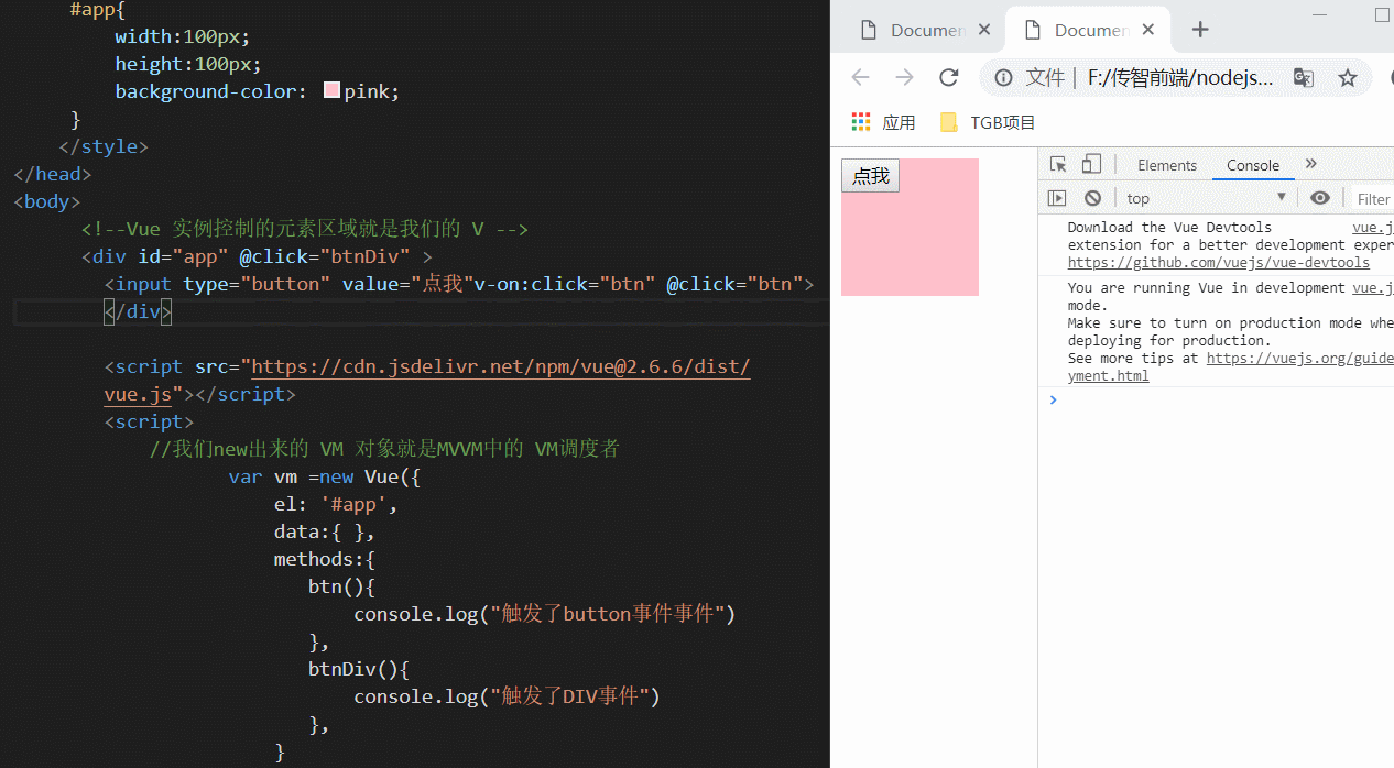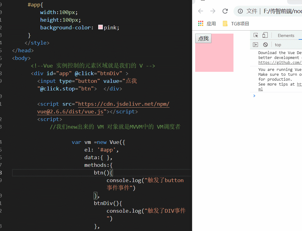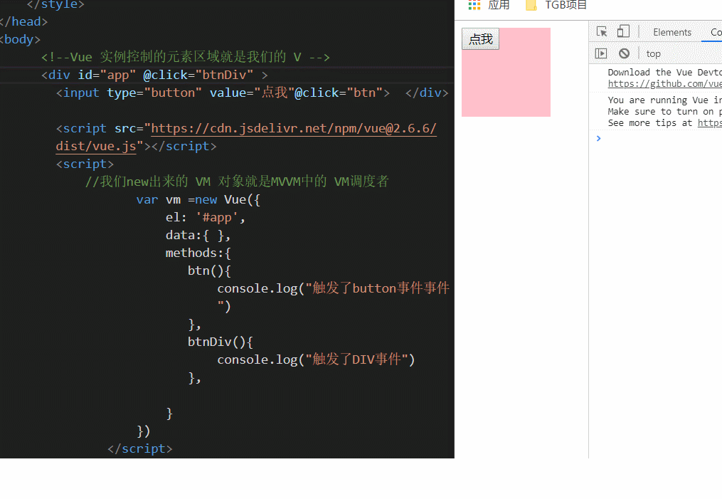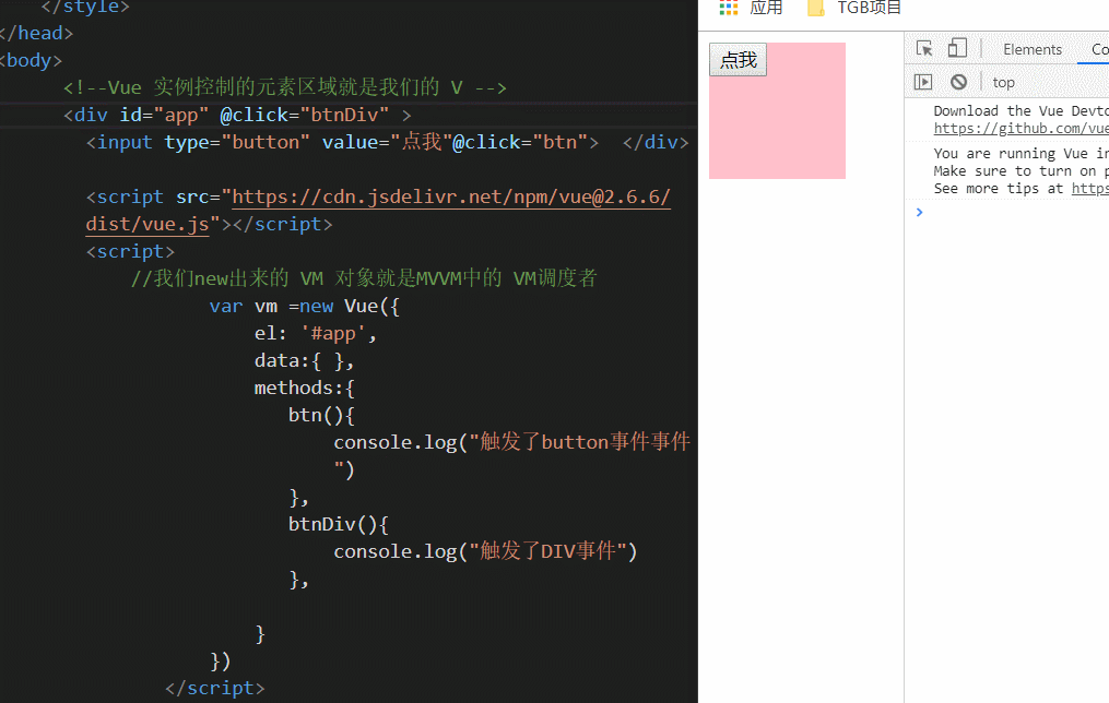 <input type="button" value="点我"v-on:click="btn" @click="btn"> </div>