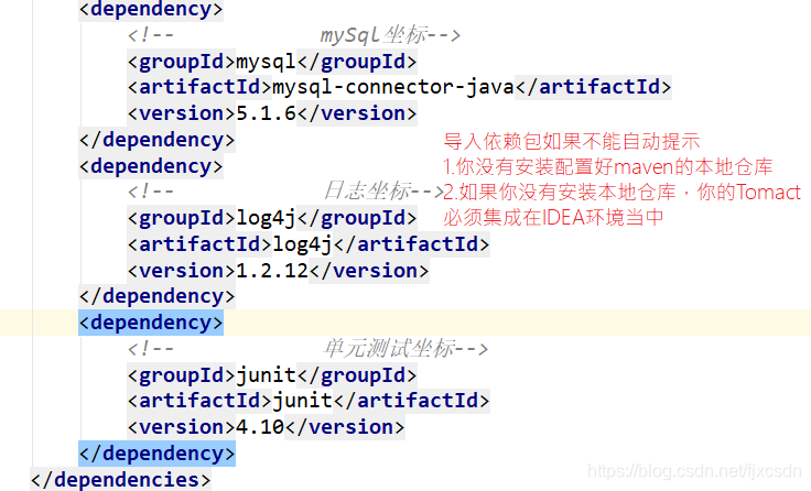 pom.xml 配置文件中,引入mysql依赖包、日志依赖包、测试依赖包、以及mybatis依赖包