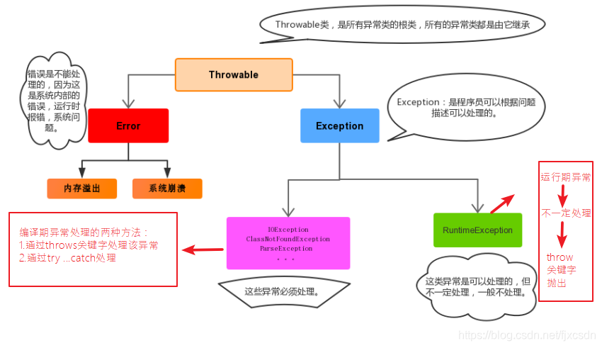 Exception:还能够解决,可捕获,且可能恢复,其中异常分为系统异常和普通异常。