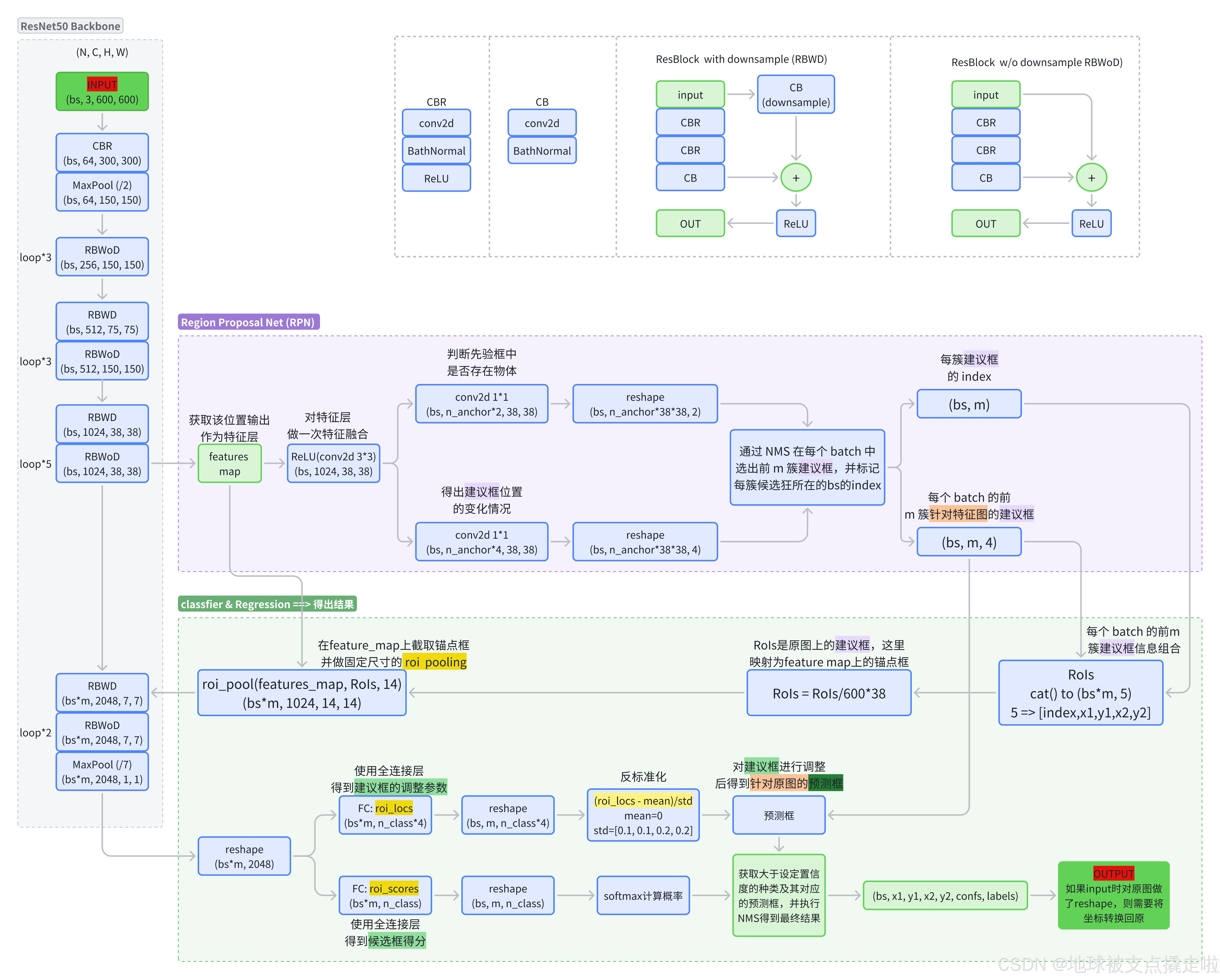 下图是我根据 https://github.com/bubbliiiing/faster-rcnn-pytorch 的复现代码画的 faster rcnn 的详细框图,包含backbone ResNet50, RPN,分类&回归器,三个部分。