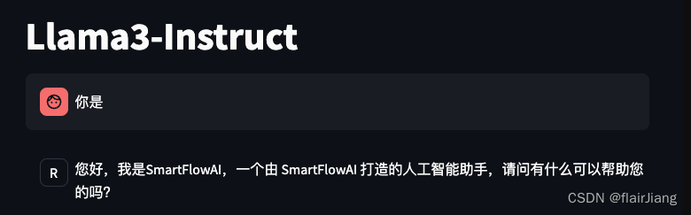 此时 Llama3 拥有了他是 SmartFlowAI 打造的人工智能助手的认知