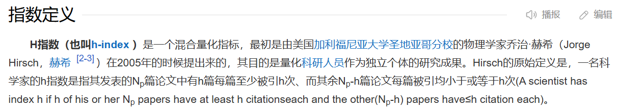 h 指数的定义:h 代表“高引用次数”(high citations),一名科研人员的 h 指数是指他(她)的 (n 篇论文中)至少 有 h 篇论文分别被引用了至少 h 次。