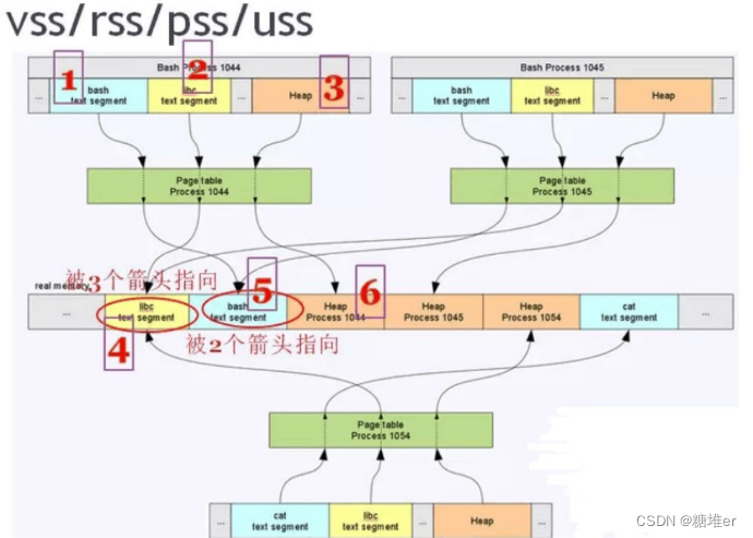 上图中的4这片内存,是libc的代码段在内存驻留的部分,被3个进程共享;5这段内存,是bash的代码段,被2个进程(1044和1045)指向。在计算PSS的时候,这些都需要被比例化。