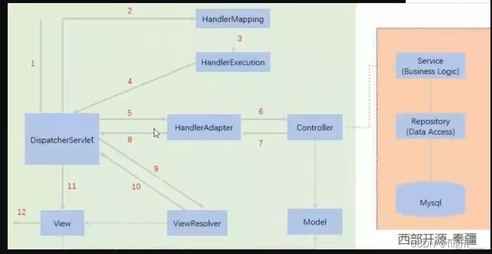 第二步(2,3,4):前端控制器会根据这个请求找到映射器(HandlerMapping),然后把这个映射器返回给DispatcherServlet
