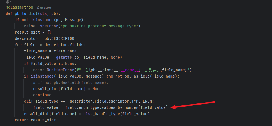 在pb2dict方法中需要先判断字段是否是repeated类型再去判断enum类型