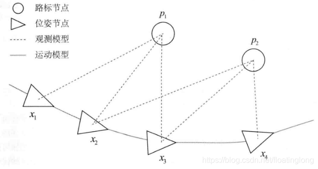 下图是一个简单的图优化例子。三角形表示相机位姿节点,圆形表示路标点,它们构成图优化的顶点;实线表示相机运动模型,虚线表示观测模型,它们构成图优化的边