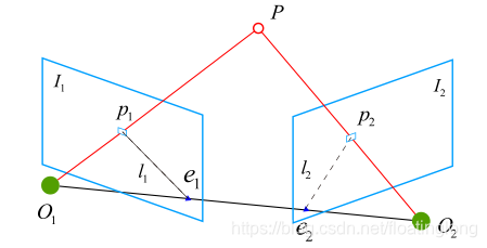 从第一帧的角度上看,射线 是某个像素 P 可能出现的空间位置,如果不知道 P 的位置,那么当我们在第二个图像上看时,极线
