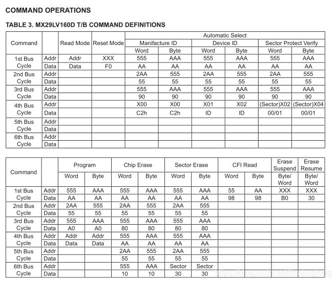 从芯片手册(MX29LV160D T/B)可以看到命令、时序等相关信息