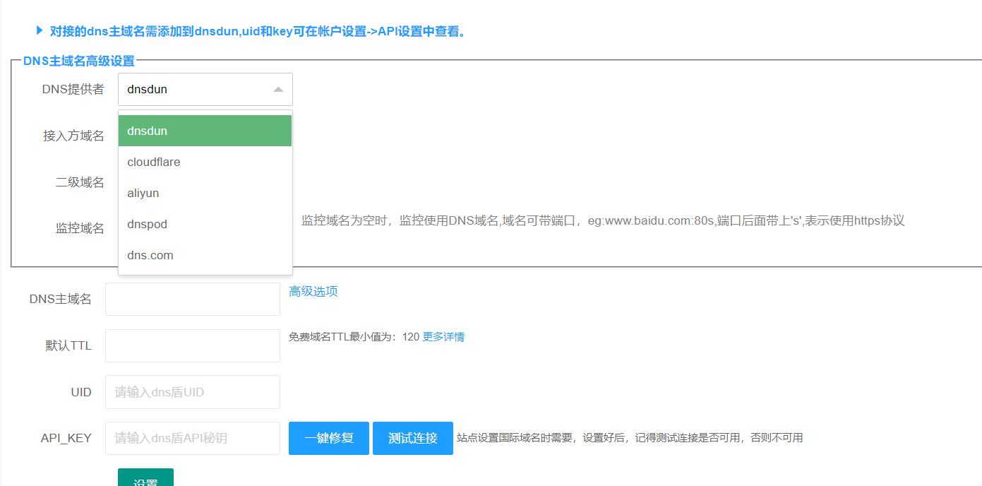 把相关信息输入系统设置-dns接入,然后点测试连接,可测试是否对接成功