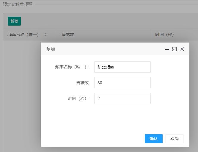 (1).触发频率没有固定参数,用户可根据自已网站正常连接请求数设置合适参数。如果请求数和时间都设为0就是绝对触发,但是通过白名单后,在白名单时间内不会再触发