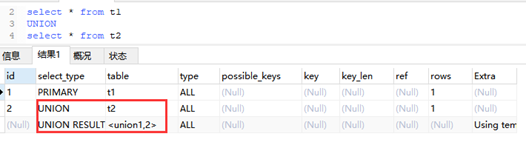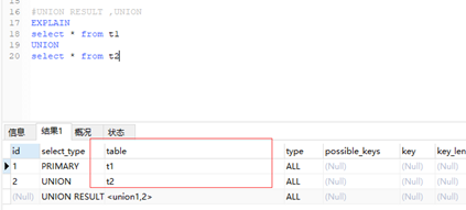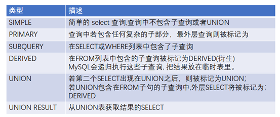 UNION:若第二个SELECT出现在UNION之后,则被标记为UNION;
