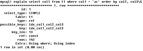EXPLAIN select col1 from t1 where col1='ac' order by col2,col3
