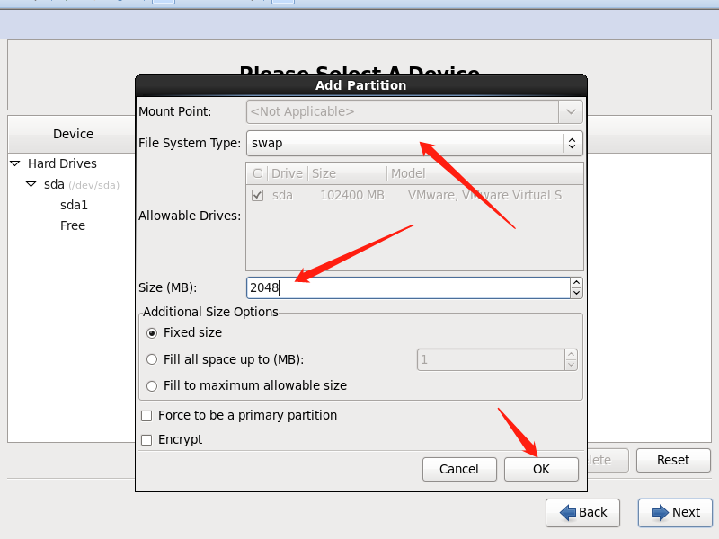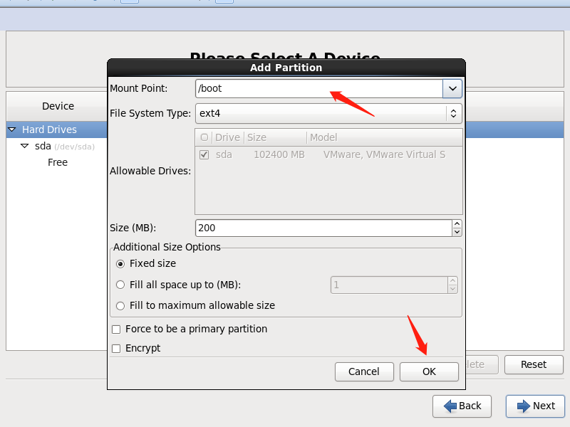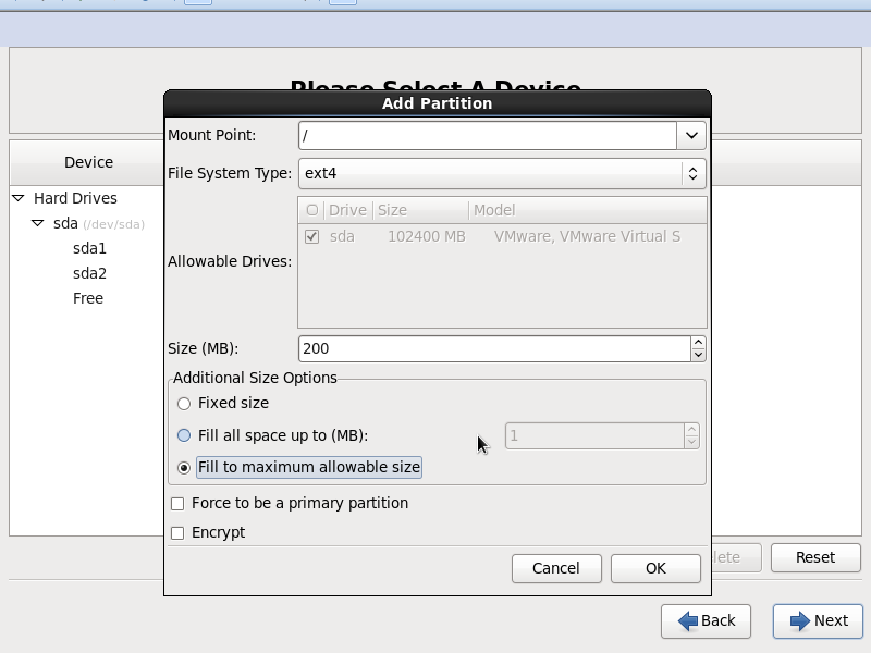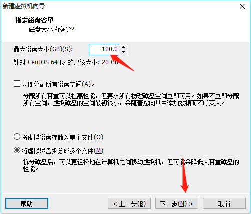 在分配磁盘空间的时候,分配100G,但是千万不到点立即分配所有空间,在这里分配100G是为了以后存储大文件时不用挂接新的磁盘了